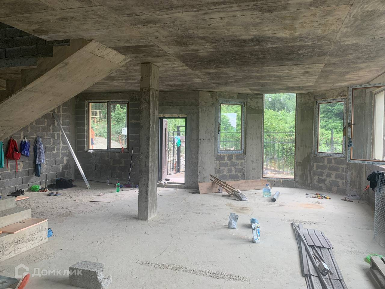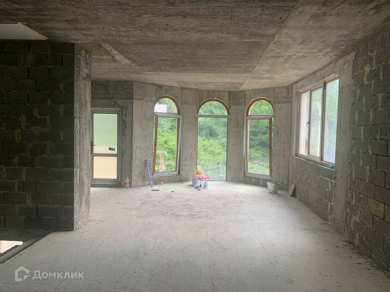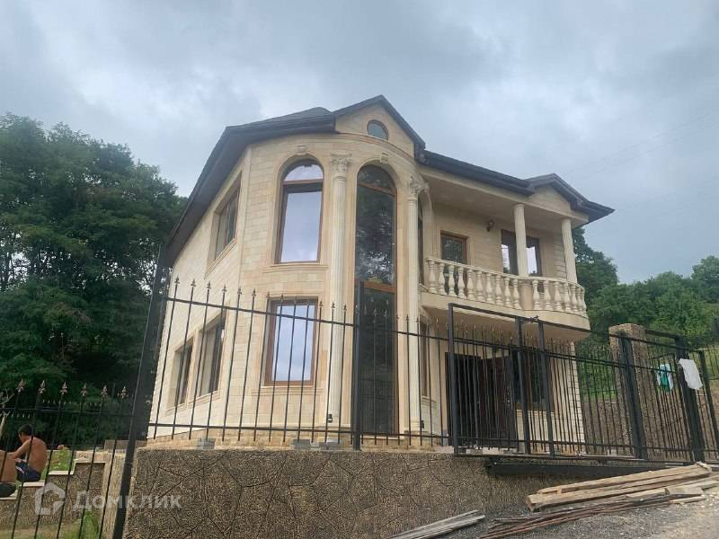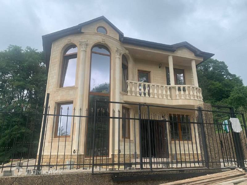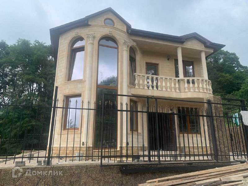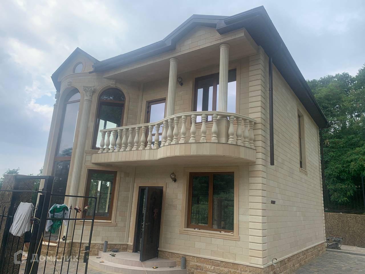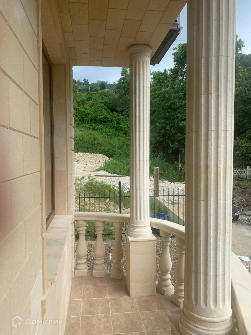Лот № 145526. Продам красивый дом общей площадью 154 кв.м. построенный в классическом стиле, построенный в Нижней Шиловке, Адлер. Отделка фасада выполнена  дагестанским камнем с оформлением балкона колоннами и балясинами. Внутри 2-этажного дома - черновая отделка, свободная планировка. Полукруглая форма этажа позволяет распланировать комнату необычной формы.