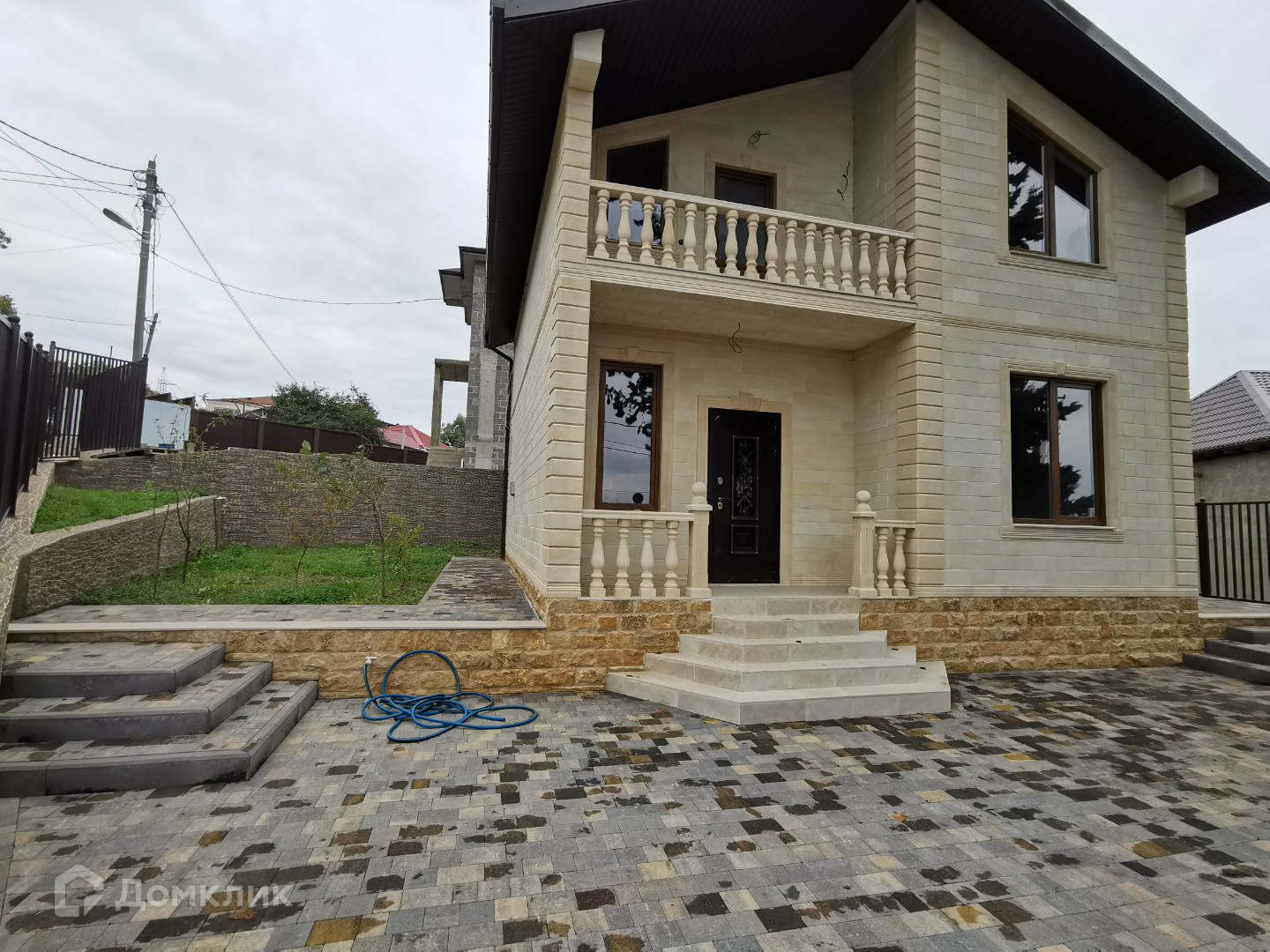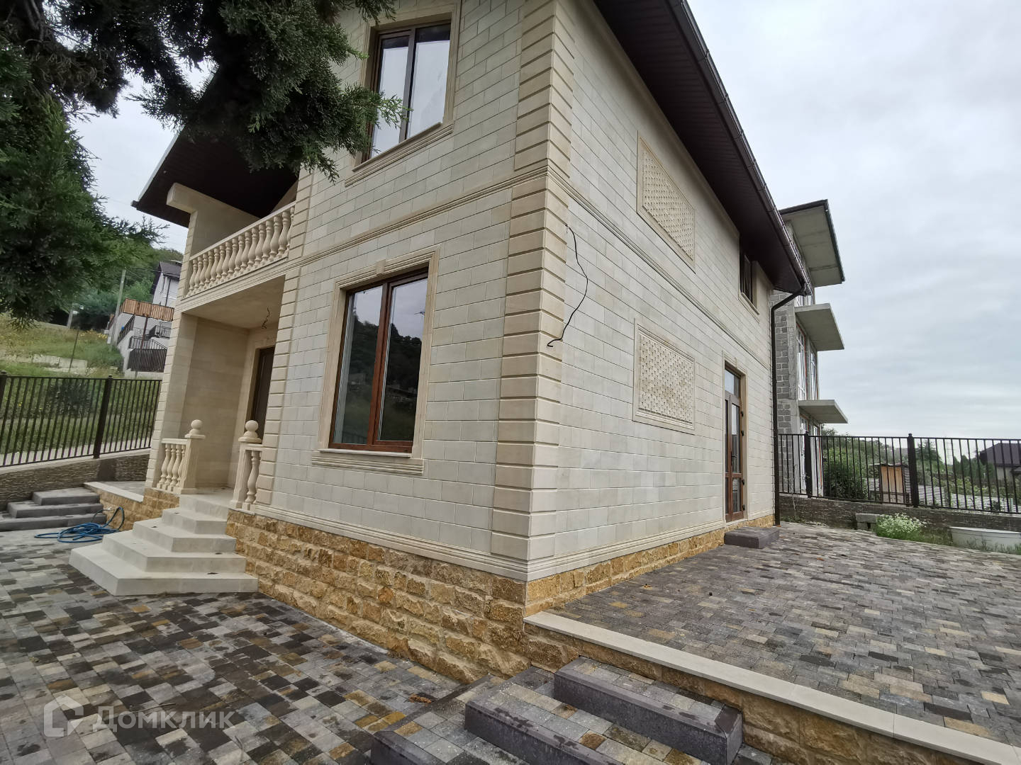 Дом с монолитным каркасом и блочным заполнением, чистовая отделка, на втором этаже сделан балкон. Отделка фасада из дагестанского камня. В доме 5 комнат. Земельный участок площадью в 3 сотки, придомовая территория облагорожена, парковка с автоматическими воротами при въезде.