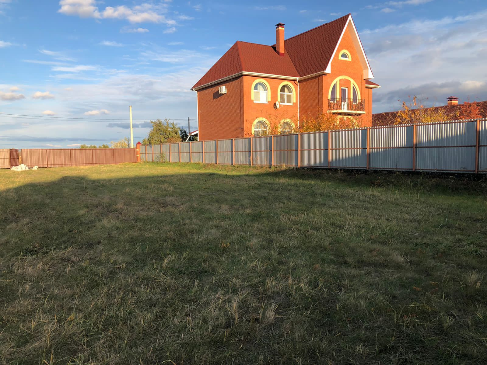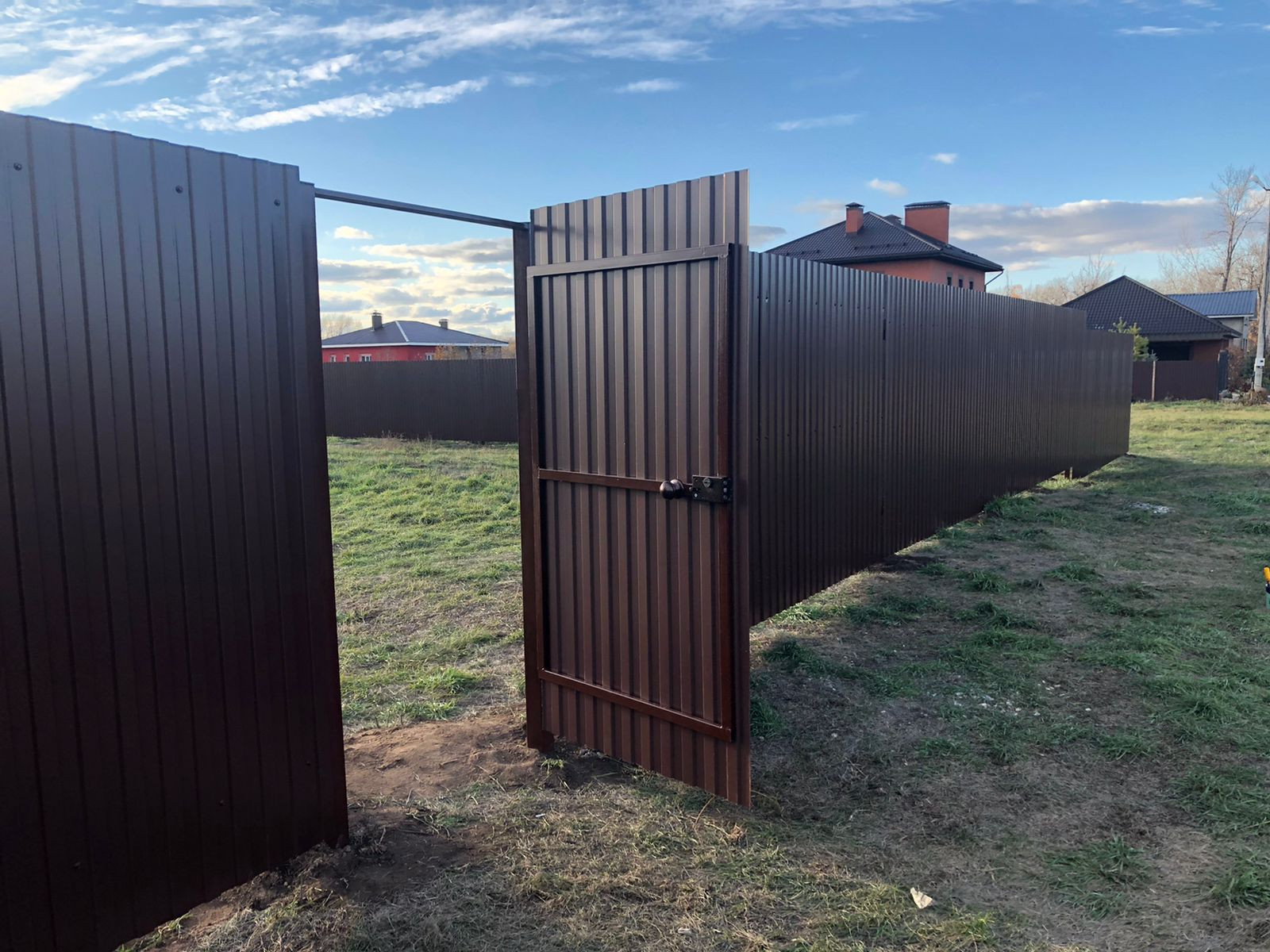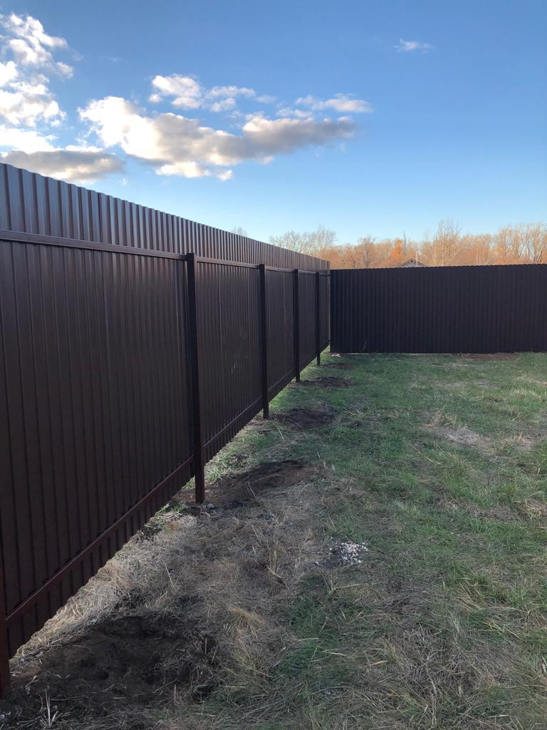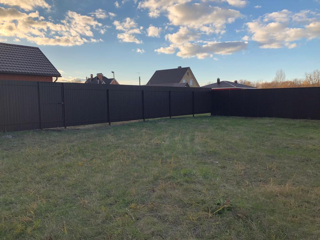 По периметру участка установлен 2х метровый забор из проф.листа с распашными воротами и двумя калитками (с лицевой стороны и со стороны пожарного проезда).