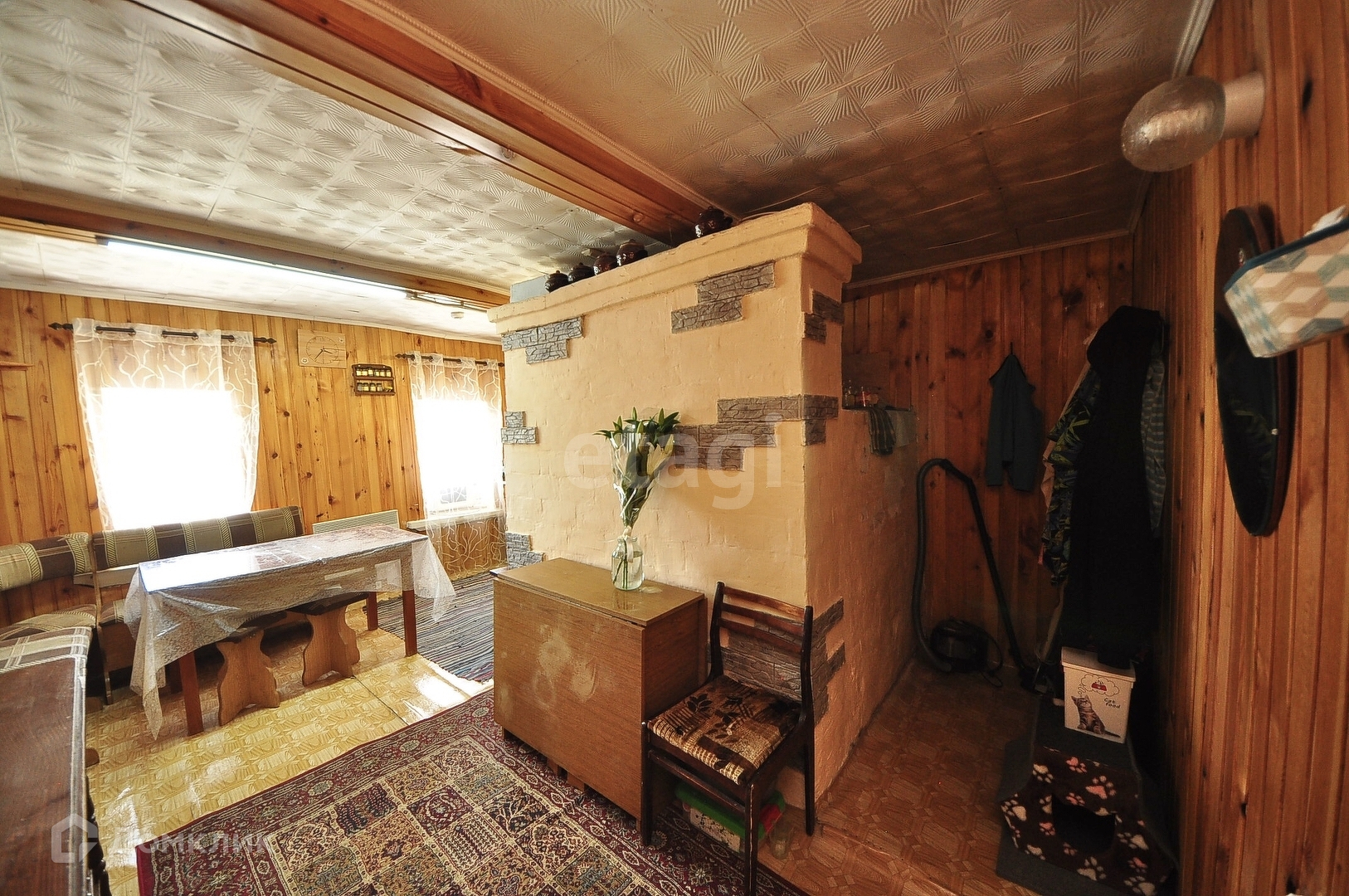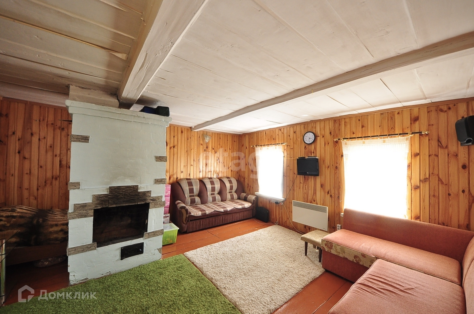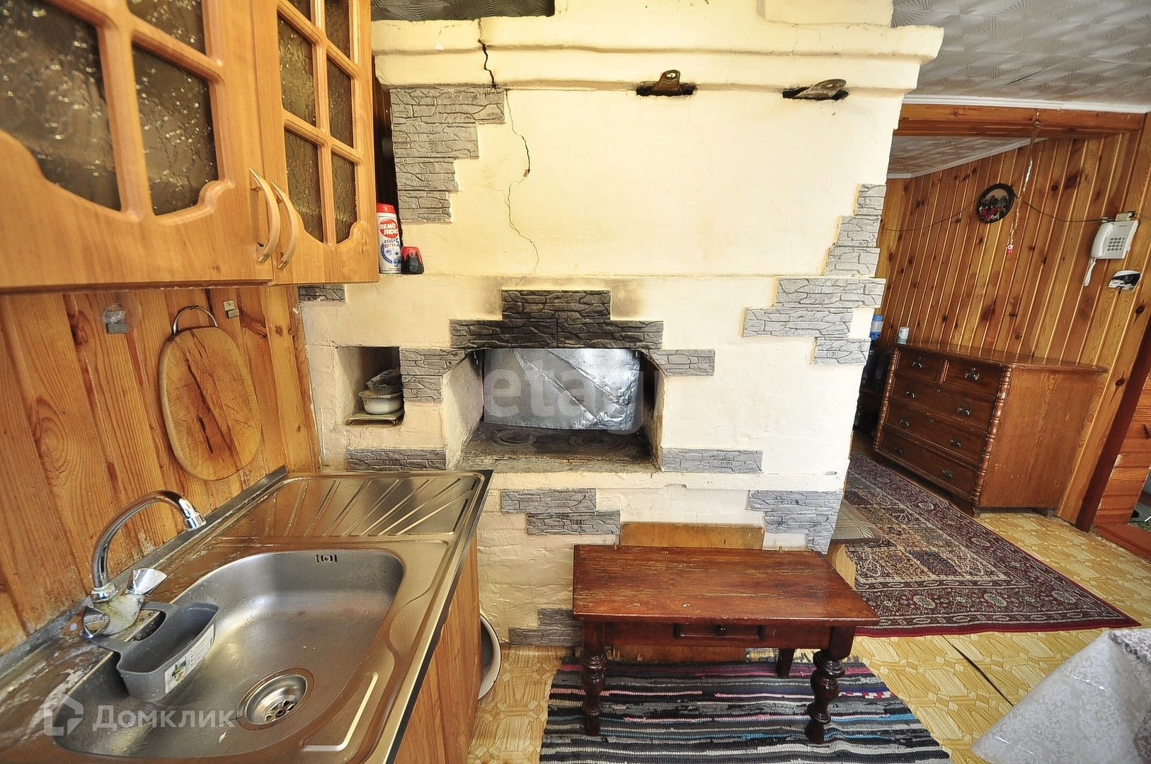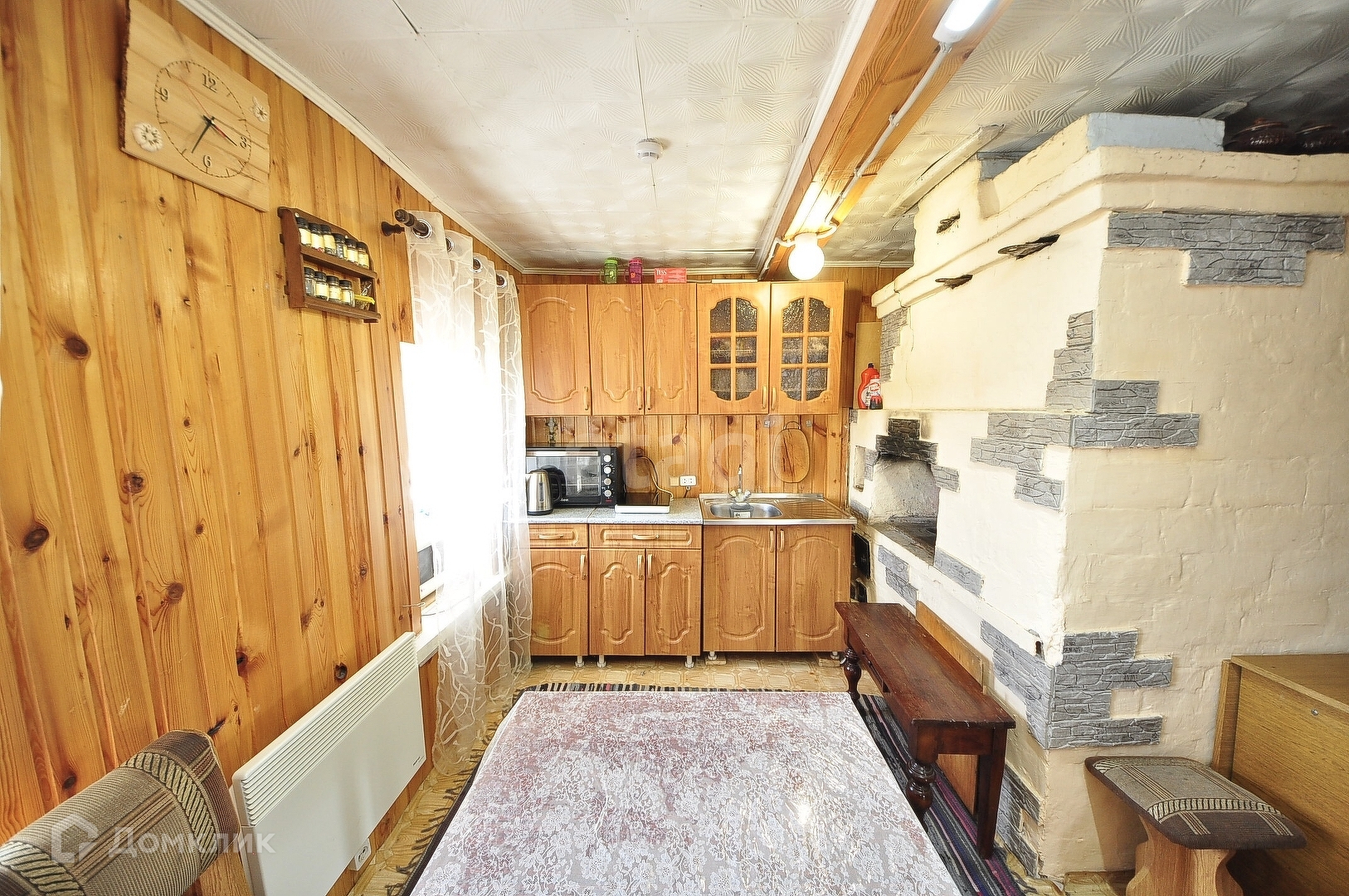 В доме имеется просторная комната с печью, стены и потолок во всем доме обшиты вагонкой.Просторная кухня, посередине печь. Имеется и другой вариант обогрева комнаты-современный конвектор. Водонагреватель в доме.