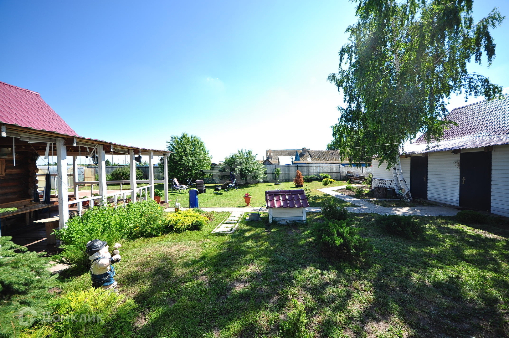 На участке тротуарной плиткой выложены все дорожки, а также место для установки каркасного бассейна.Напротив поляна, где расположены кресло-качалка, и лежаки для солнечных ванн.