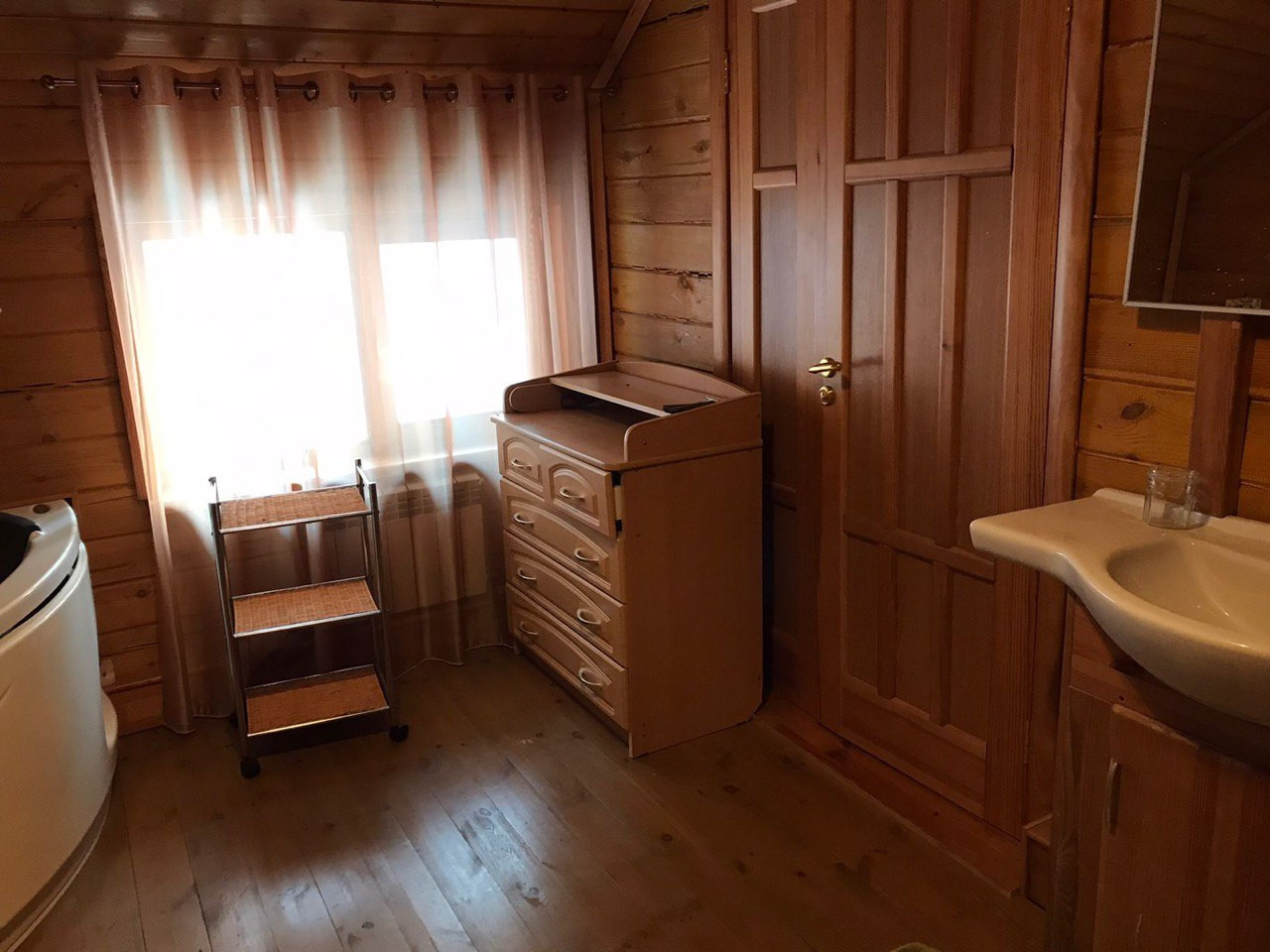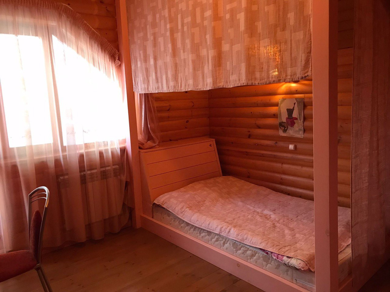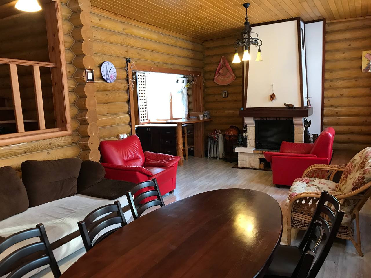 Один из кругляка 2008 года постройки, стоит на леточном фундаменте, теплый пол на первом этаже. Площадь 175,5 кв.м. в два этажа. На первом этаже: кухня-гостиная с действующим камином, гостевая комната, сауна и санузел. Второй этаж: две детские, объединенные балконом и родительская мастер-спальня.