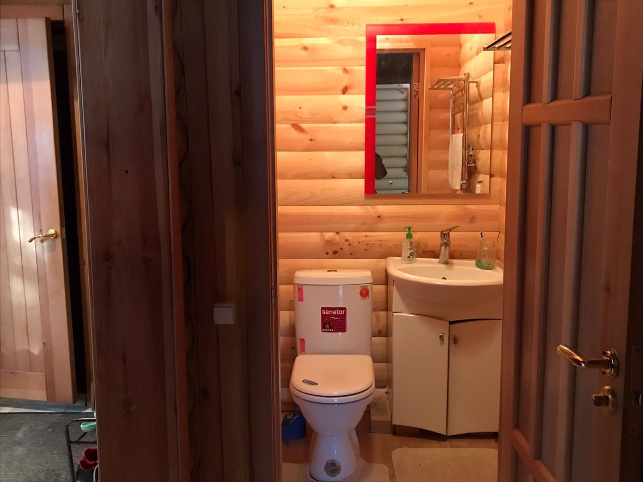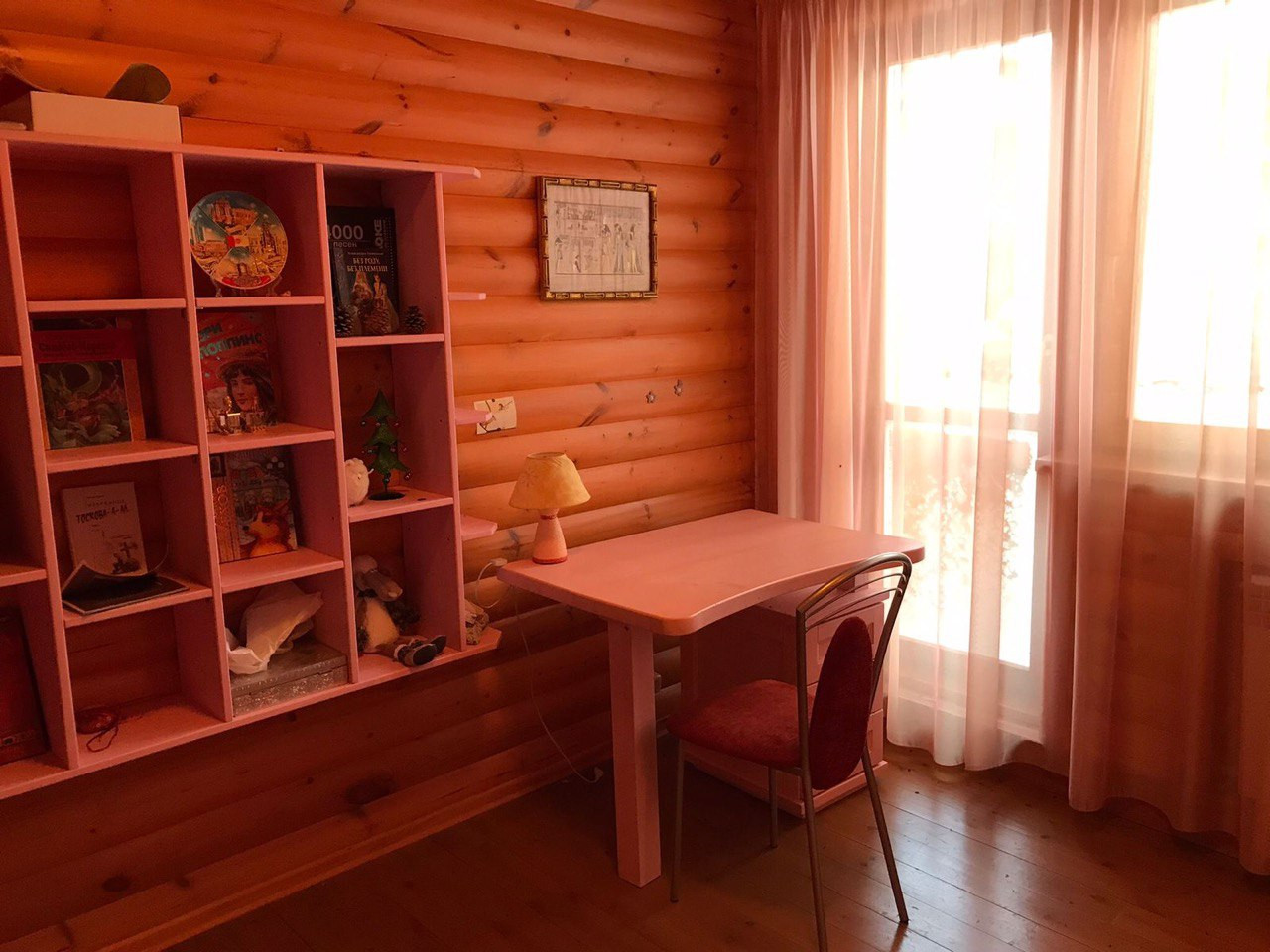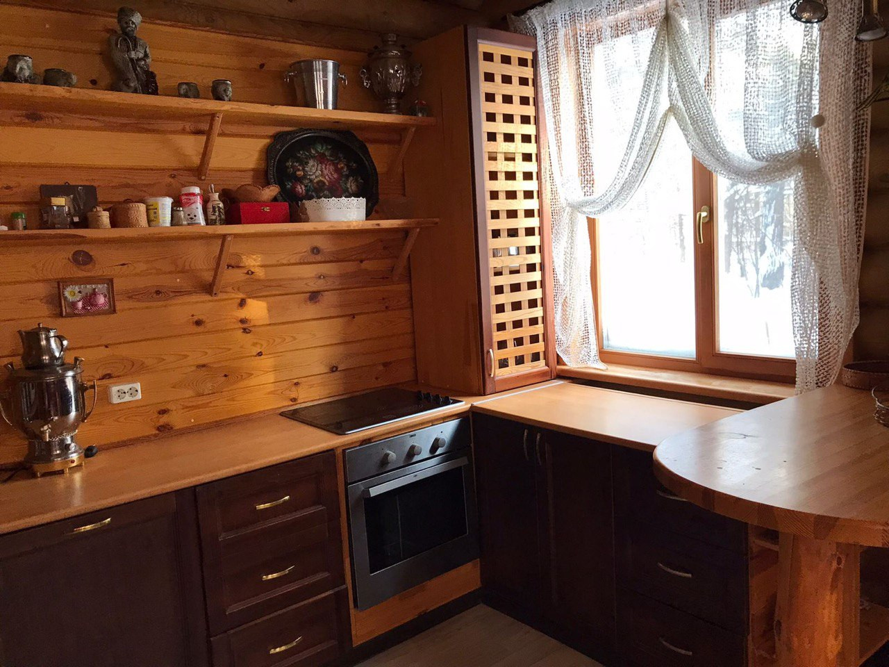 Один из кругляка 2008 года постройки, стоит на леточном фундаменте, теплый пол на первом этаже. Площадь 175,5 кв.м. в два этажа. На первом этаже: кухня-гостиная с действующим камином, гостевая комната, сауна и санузел. Второй этаж: две детские, объединенные балконом и родительская мастер-спальня.