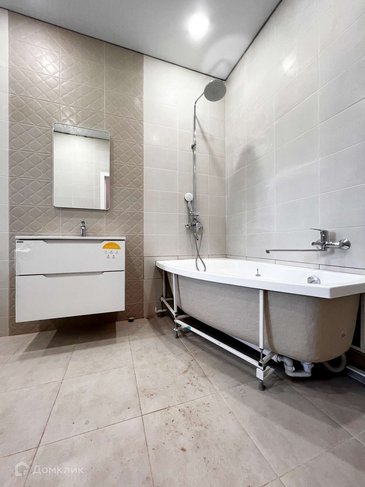 Большой санузел в плитке в теплых тонах.