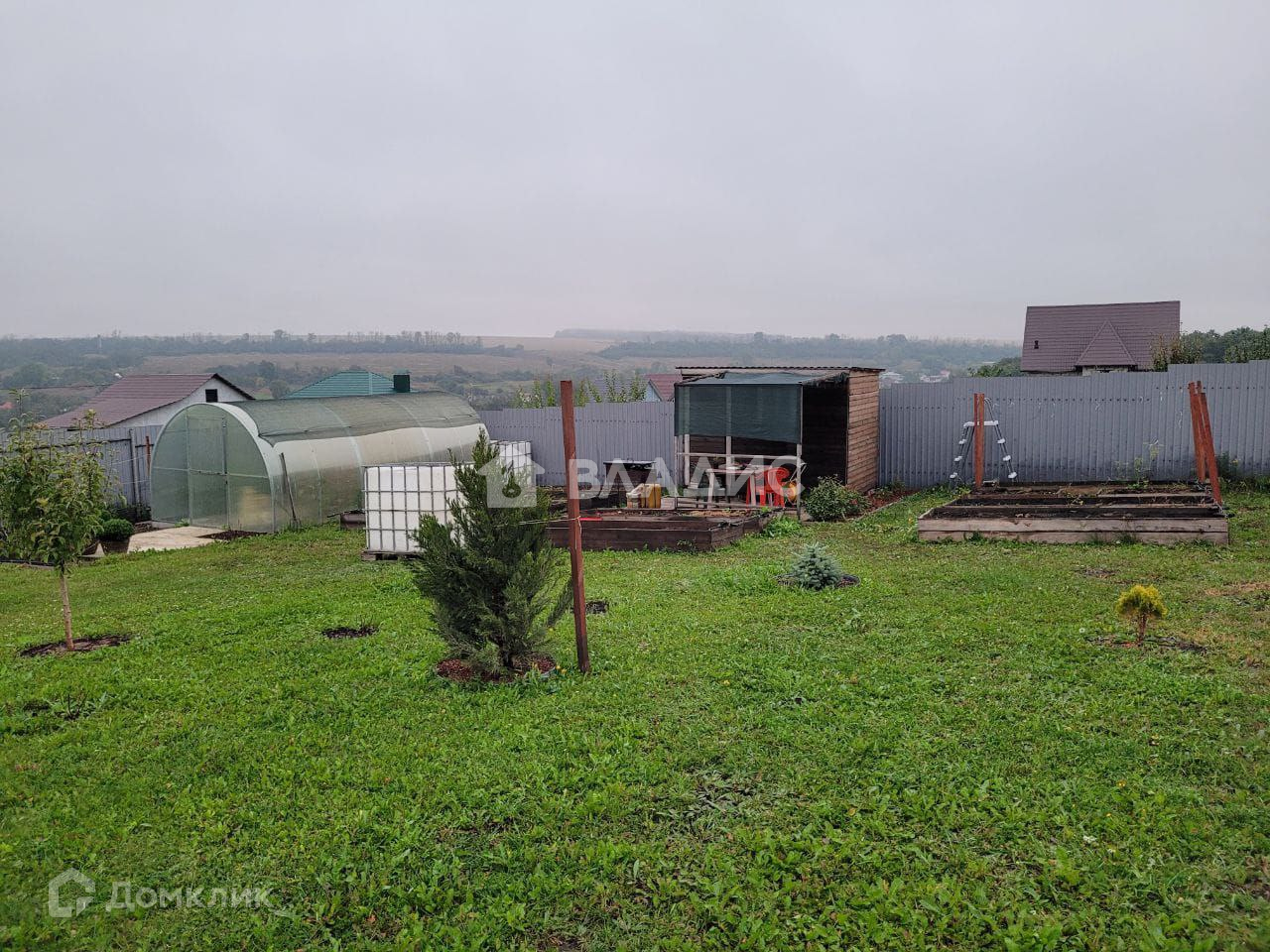 Участок с небольшим уклоном, прямоугольной формы, огорожен со всех сторон.