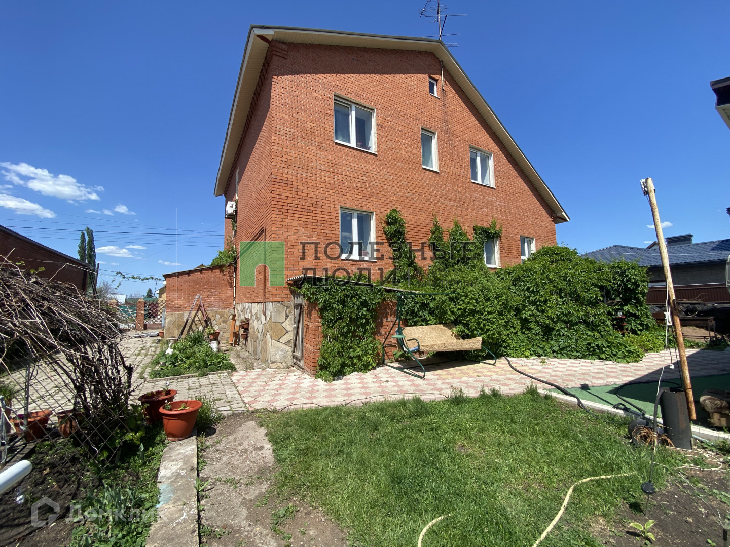 Под крытым тентом во дворе установлен каркасный бассейн на 21 тонну - отличное место для отдыха и развлечений.