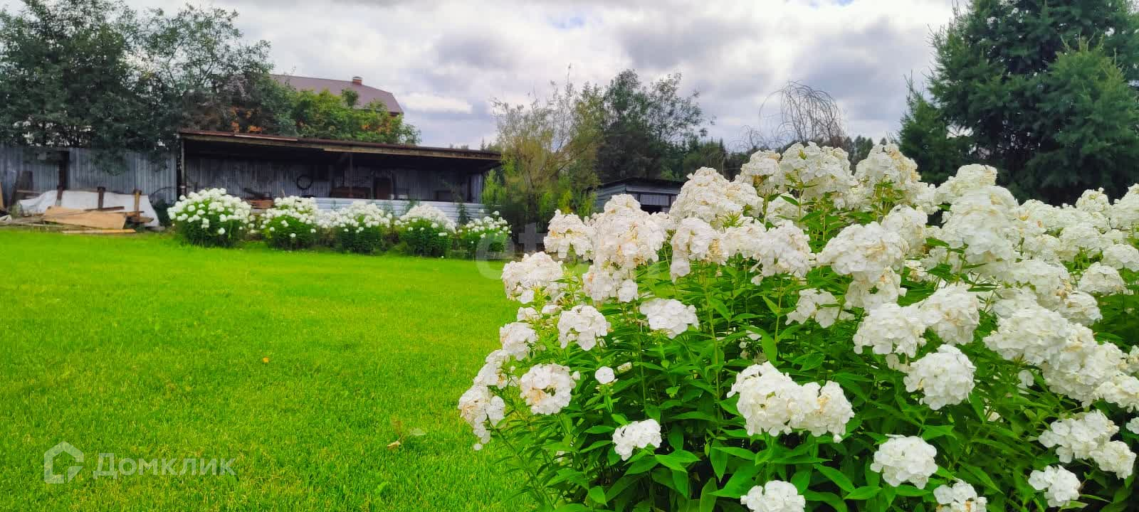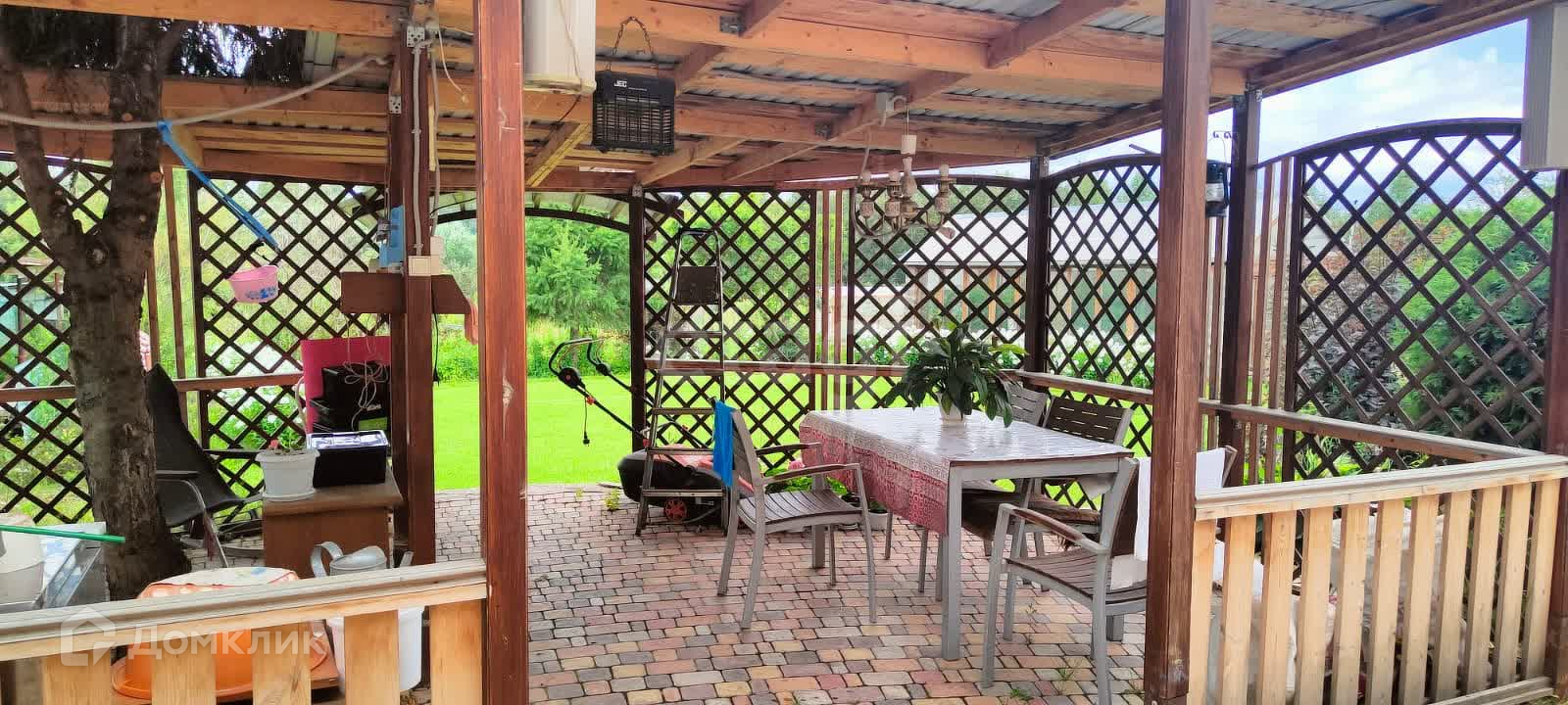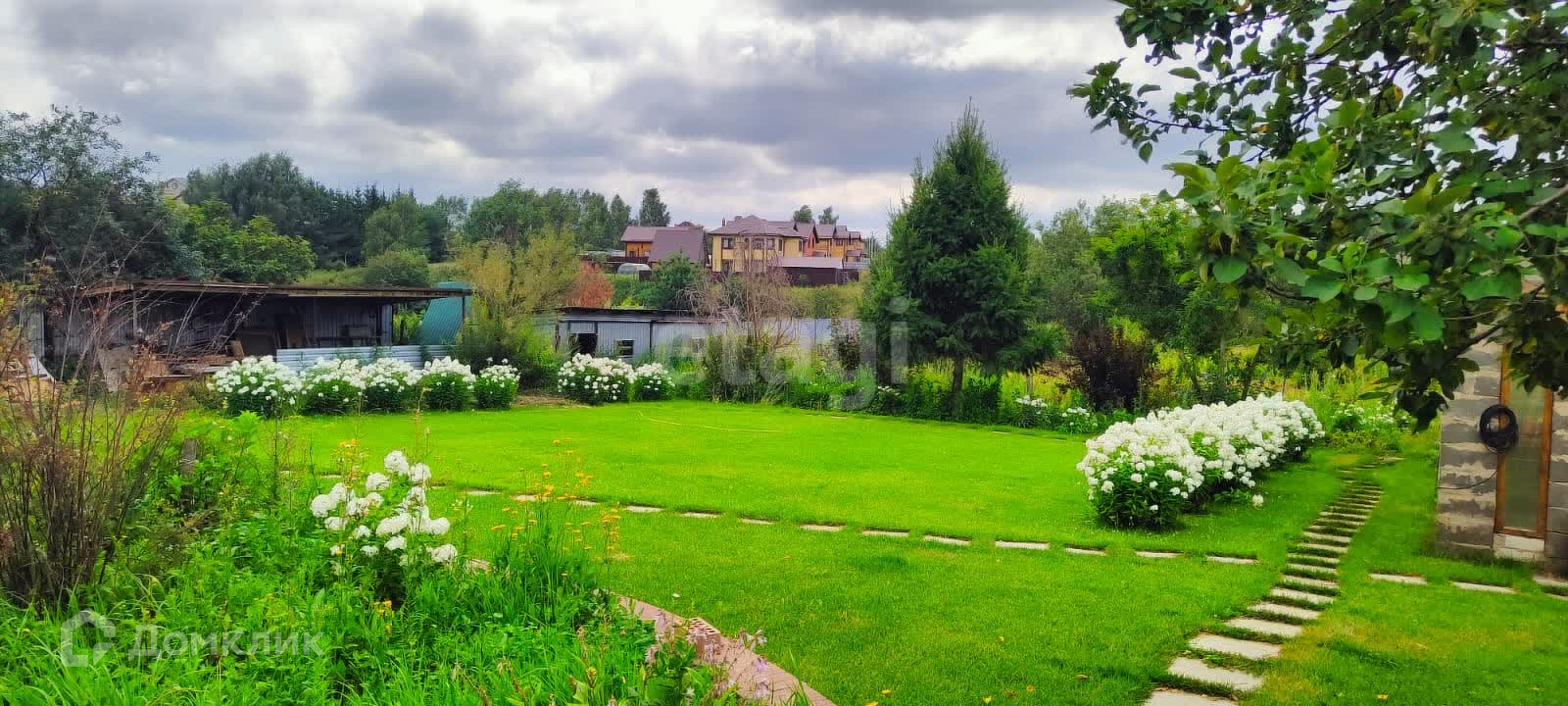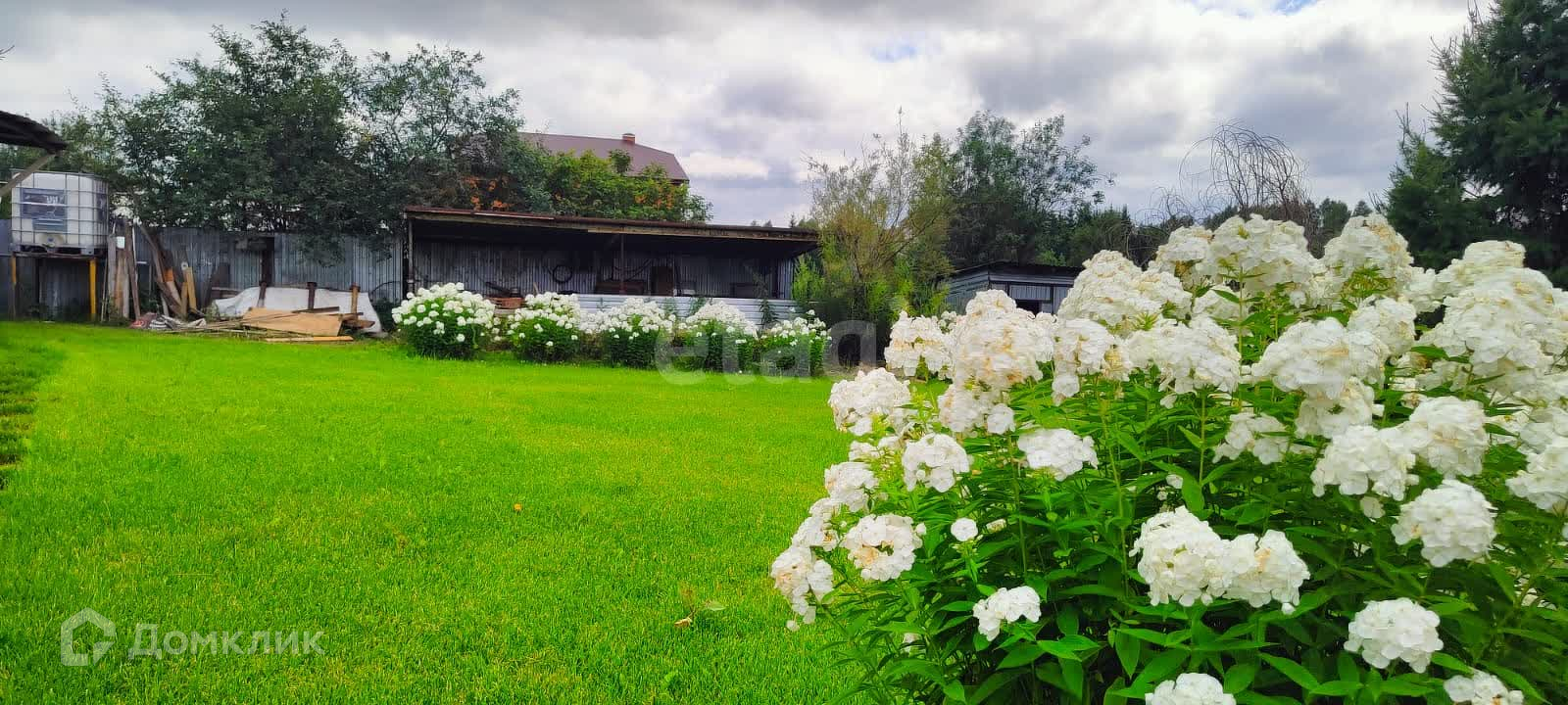 На территории сада есть летняя беседка, мангальная зона и зона отдыха с качелями. В саду газон, много деревьев и цветов.