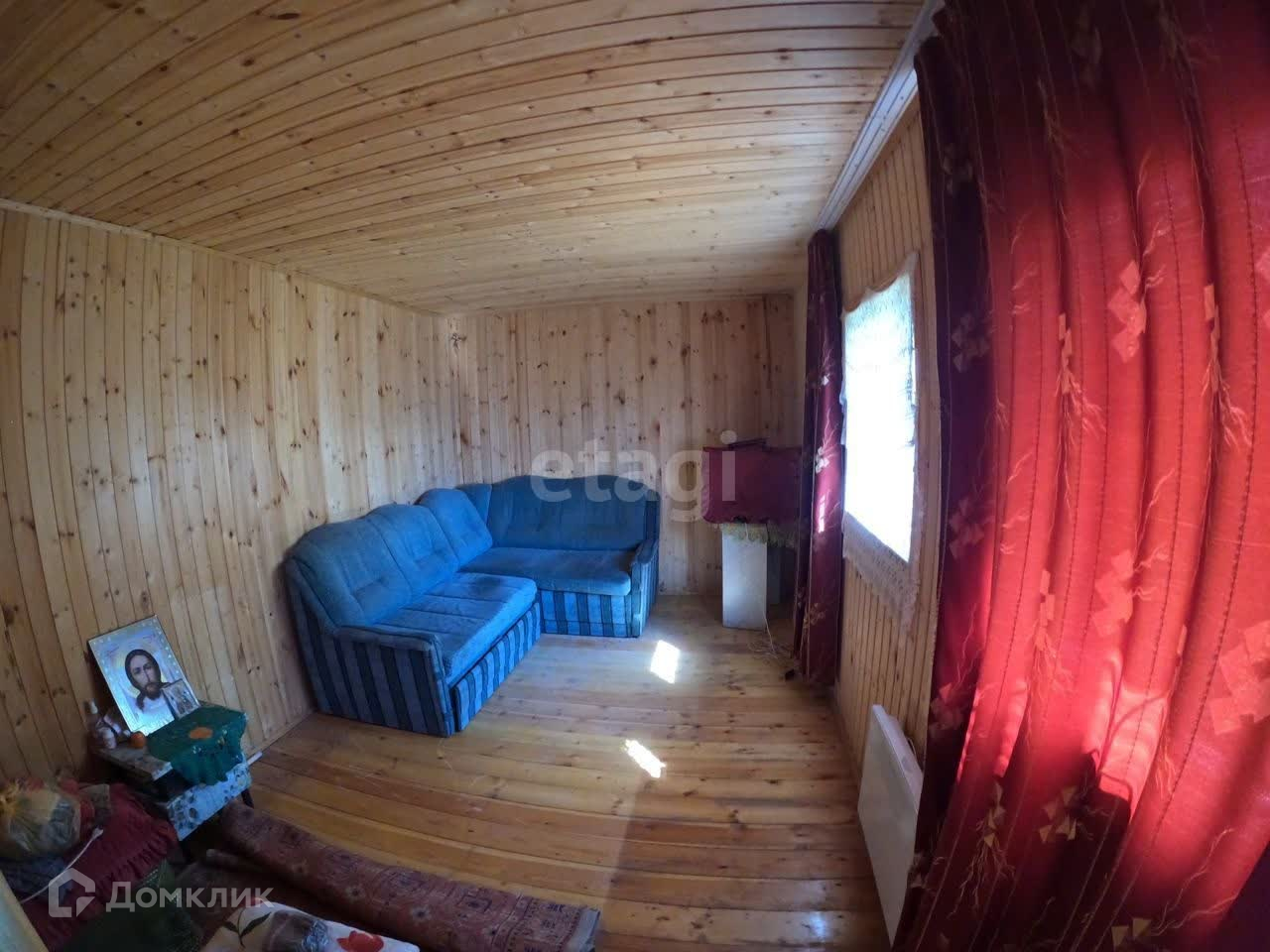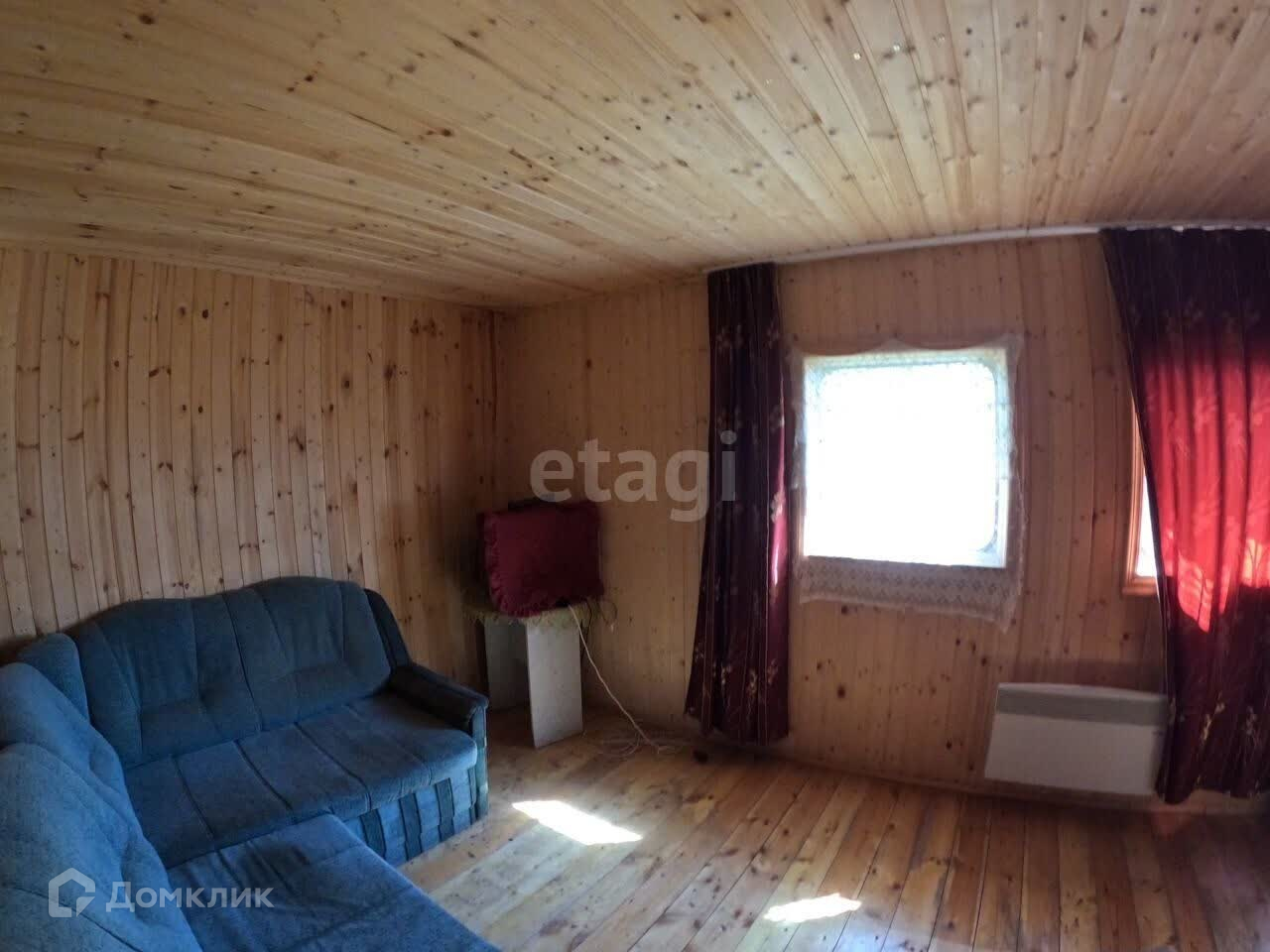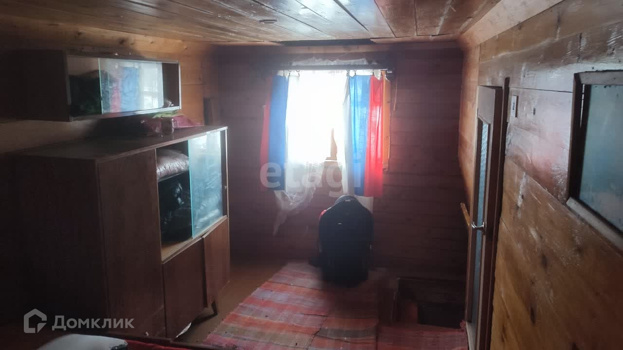 В основе дома стоит вагон, который поднят на сваи. Внутренняя отделка - дерево (вагонка). Есть второй этаж, также отделан деревом.