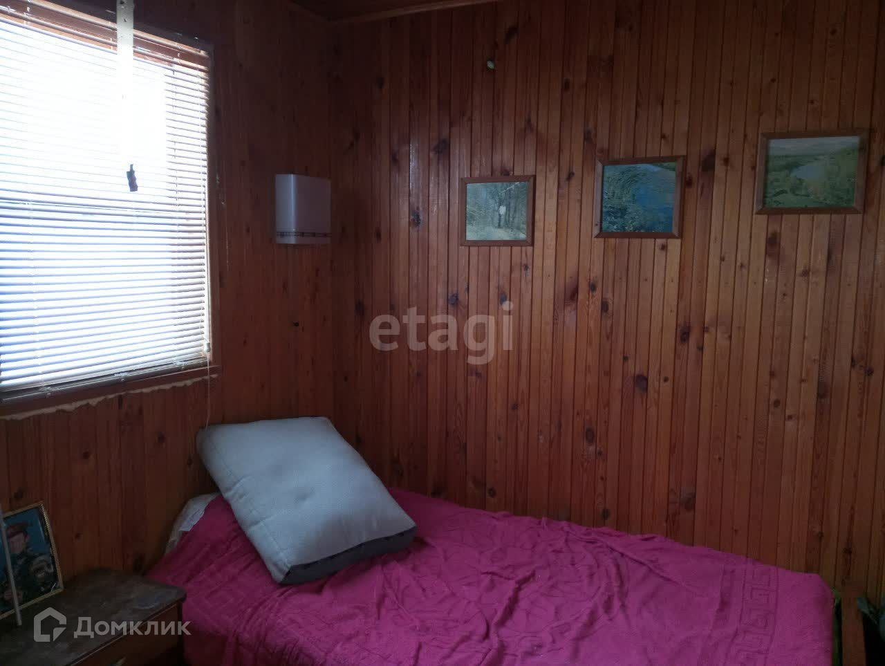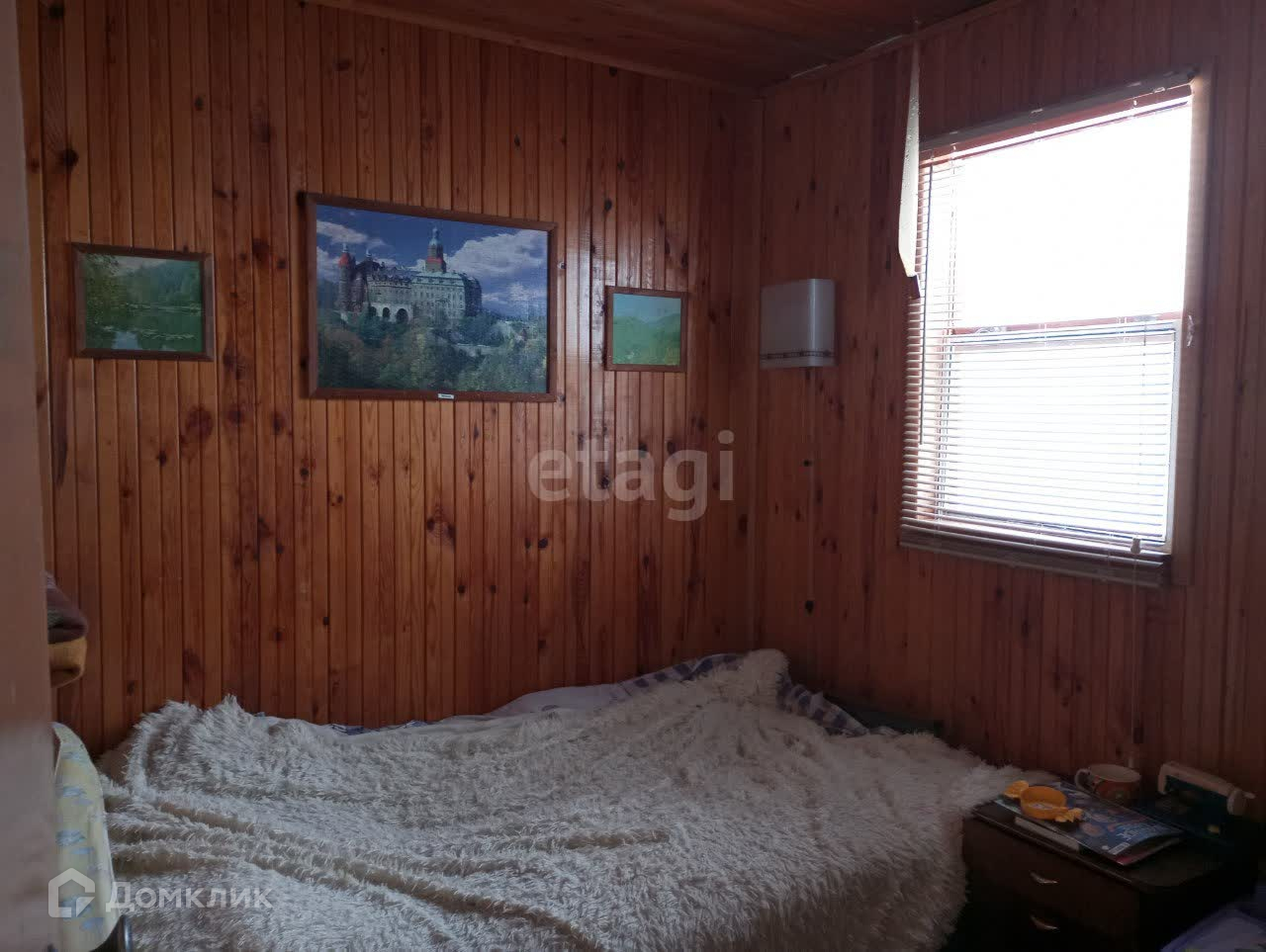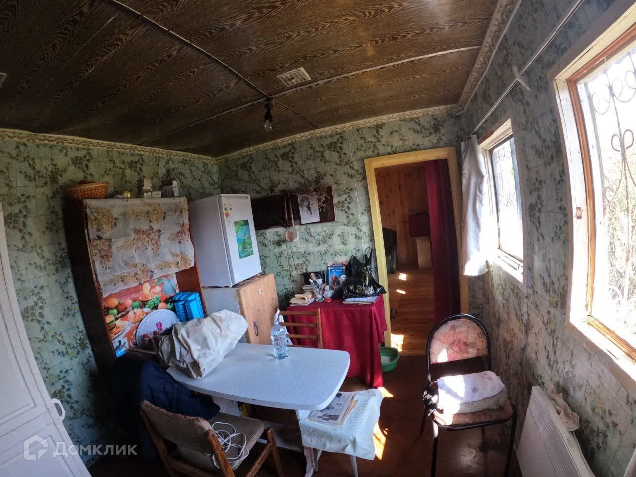 В основе дома стоит вагон, который поднят на сваи. Внутренняя отделка - дерево (вагонка). Есть второй этаж, также отделан деревом.