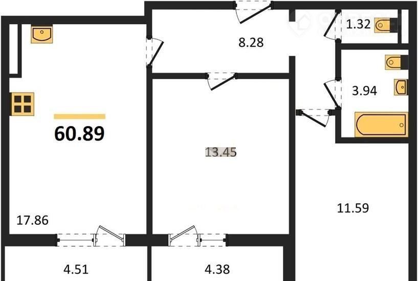 Общая площадь 60.9 м2