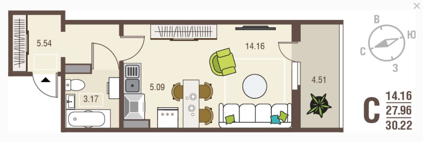 Общая площадь 30.22 м2