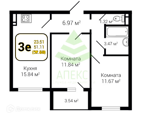 Функциональная планировка: общая площадь жилых комнат 23,51 кв. м. в одной из которых, осуществляется выход на лоджию, светлая кухня-гостинная 15,84 кв. м., раздельный санузел общей площадью 4,79 кв. м., просторный холл 6,97 кв. м.