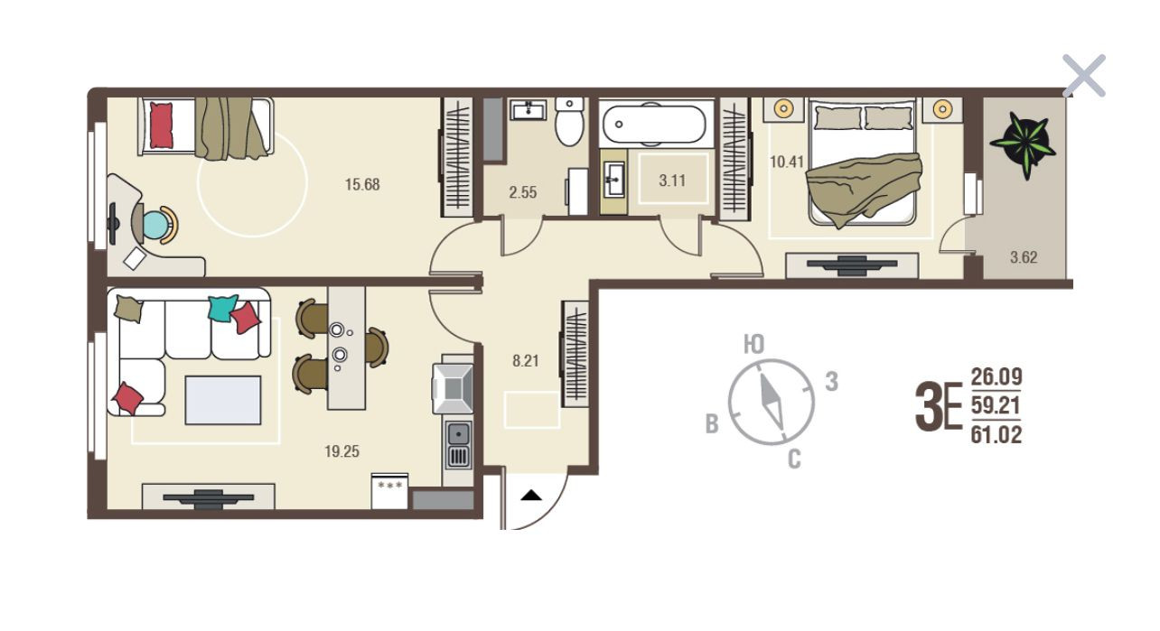 Общая площадь 61 м2