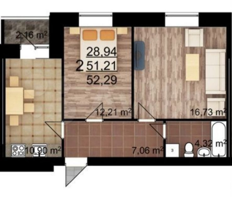 Общая площадь 52.2 м2