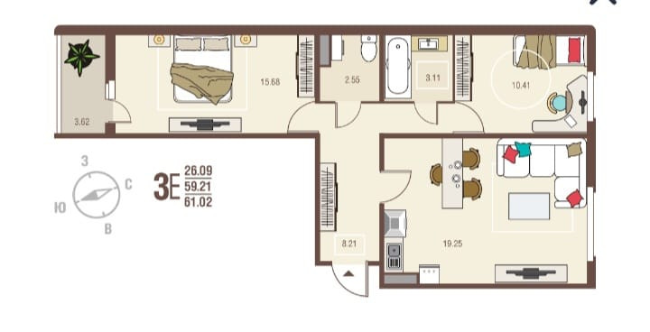 Общая площадь 61 м2