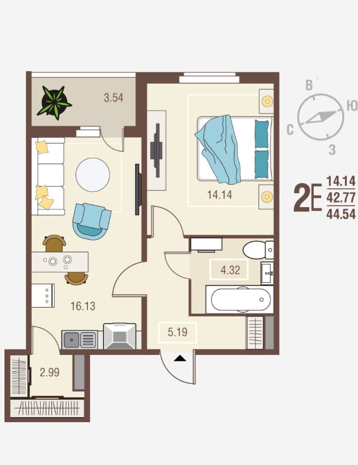 Общая площадь 44.54 м2