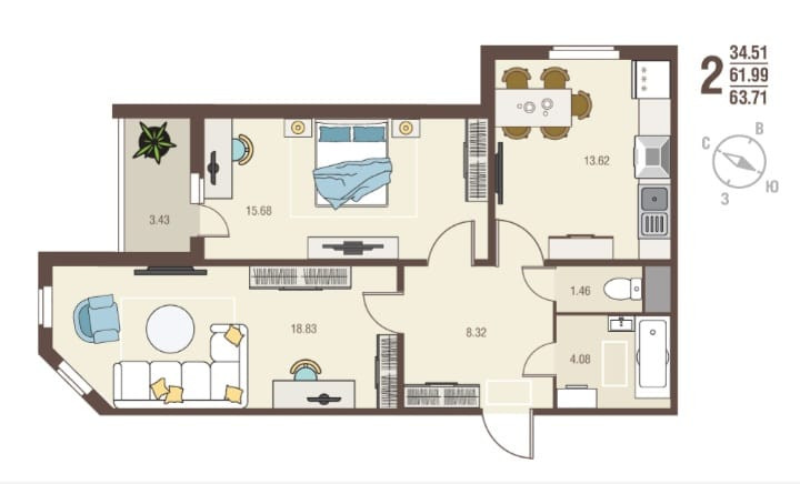 Общая площадь 63.71 м2