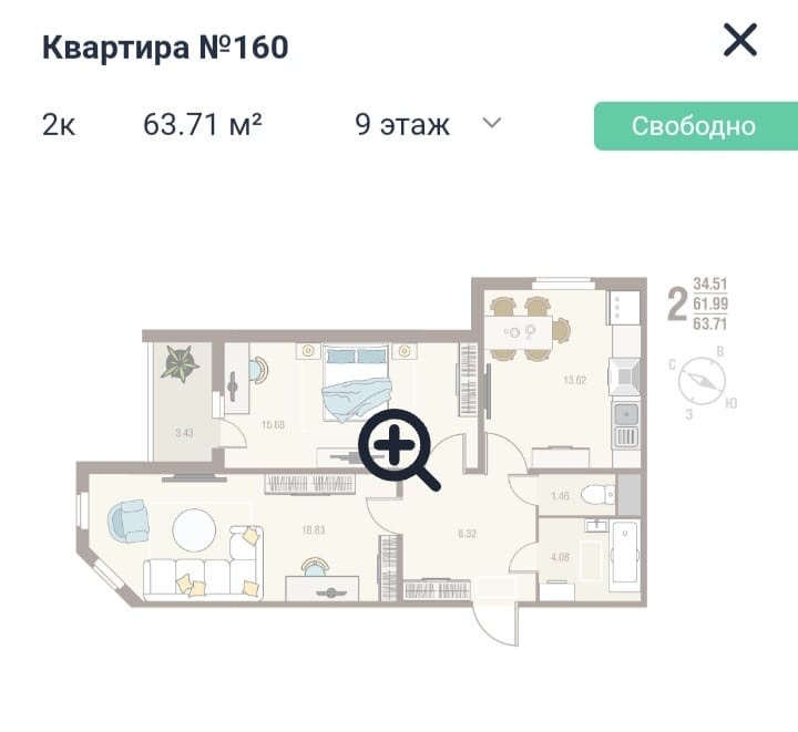 2-комнатная квартира, 63.71 м2, этаж 9 / 10, на продажу в селе Новая Усмань, Алмазная улица, 4