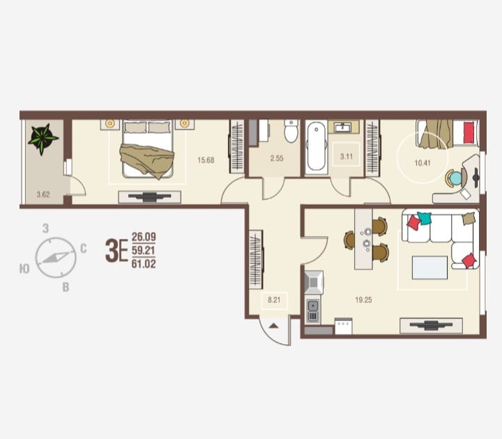 Общая площадь 61.02 м2