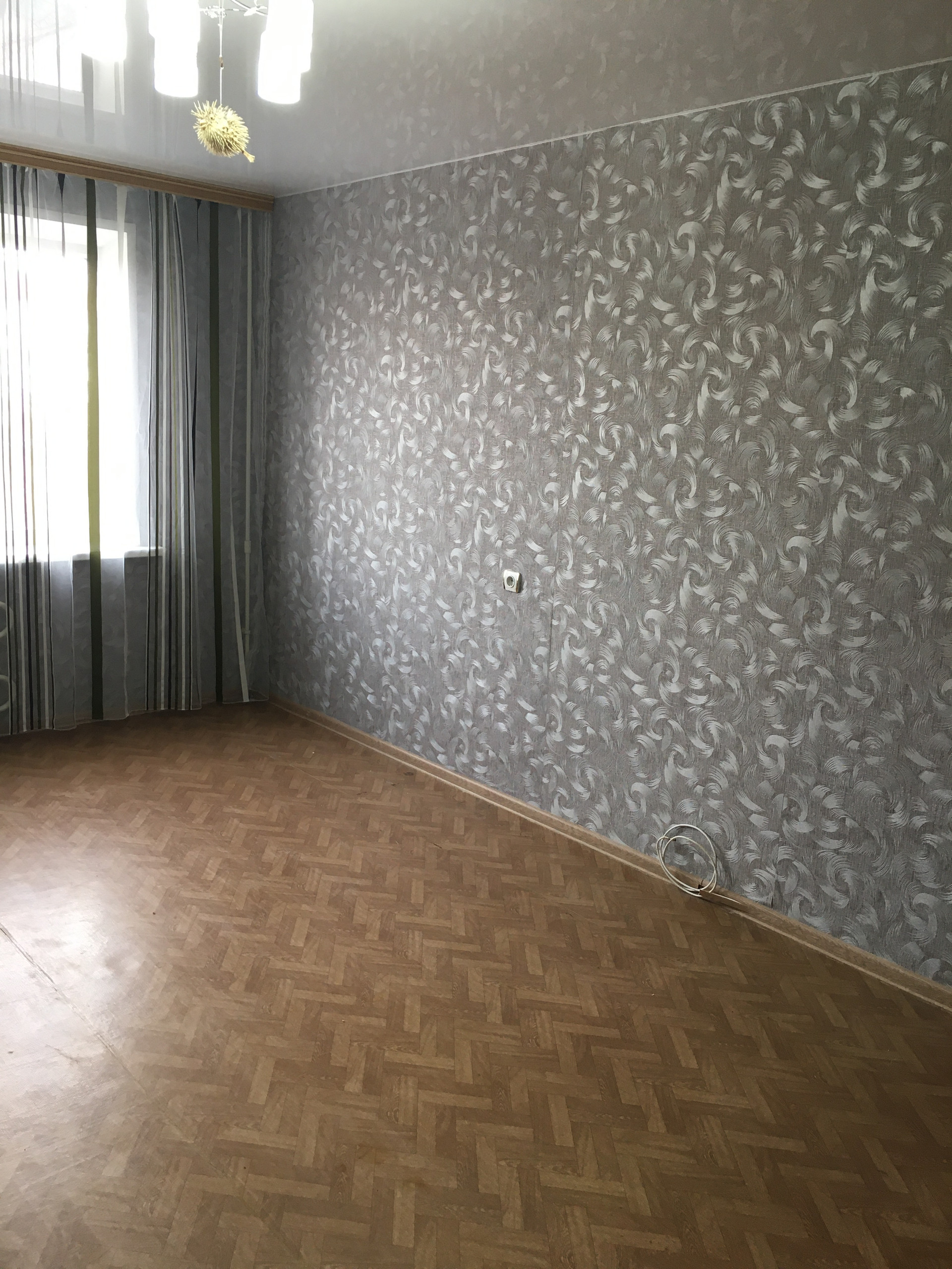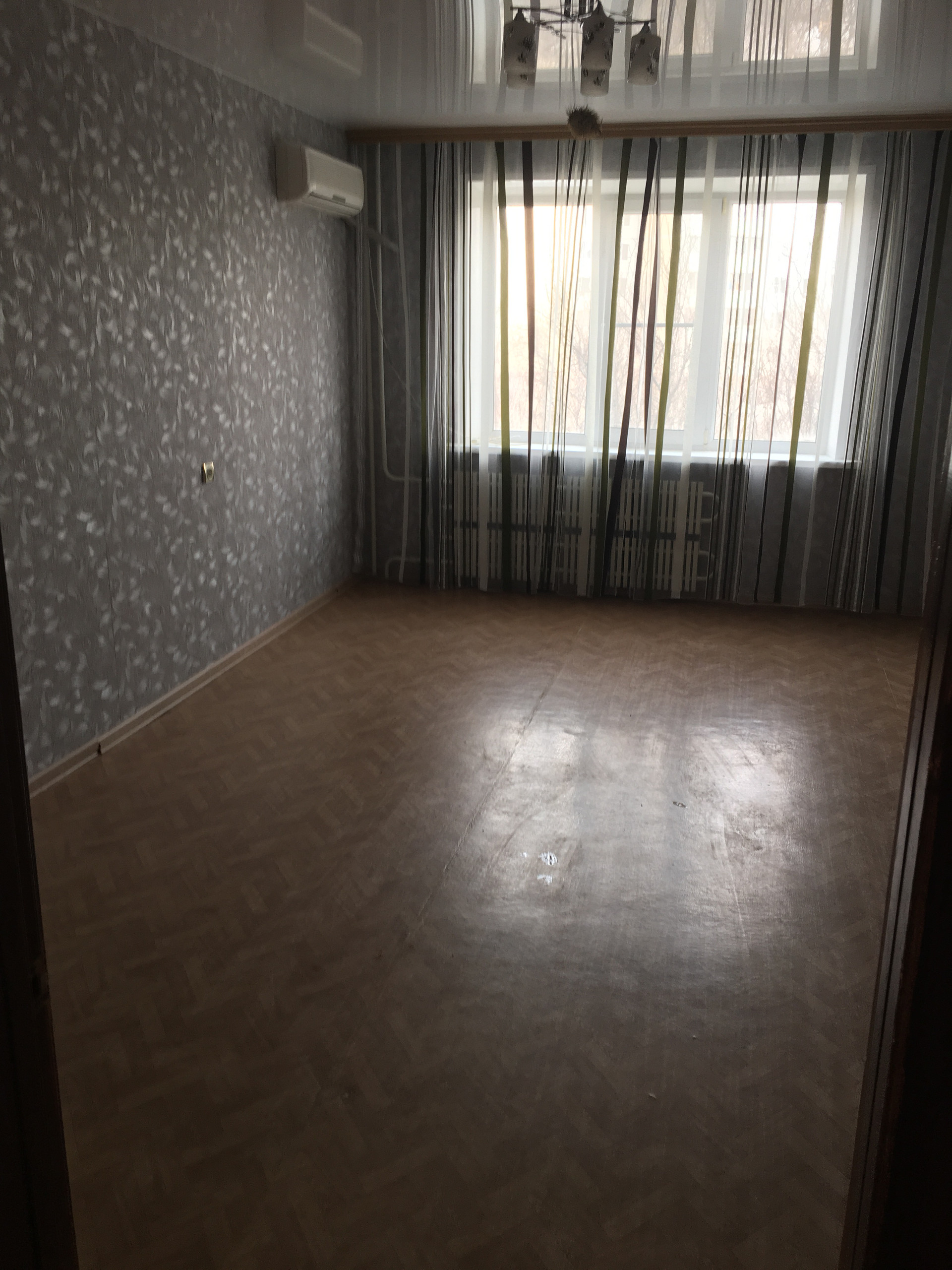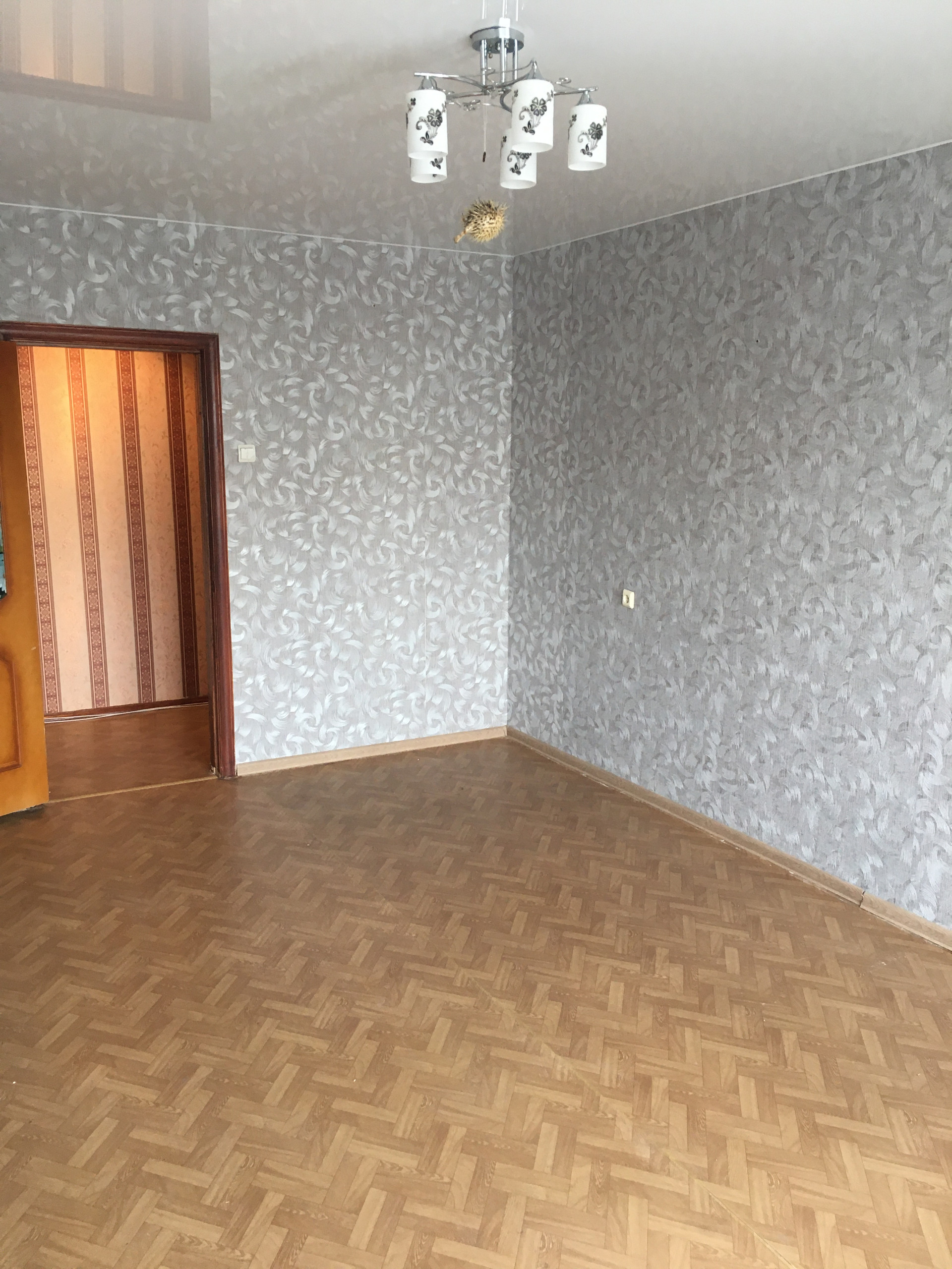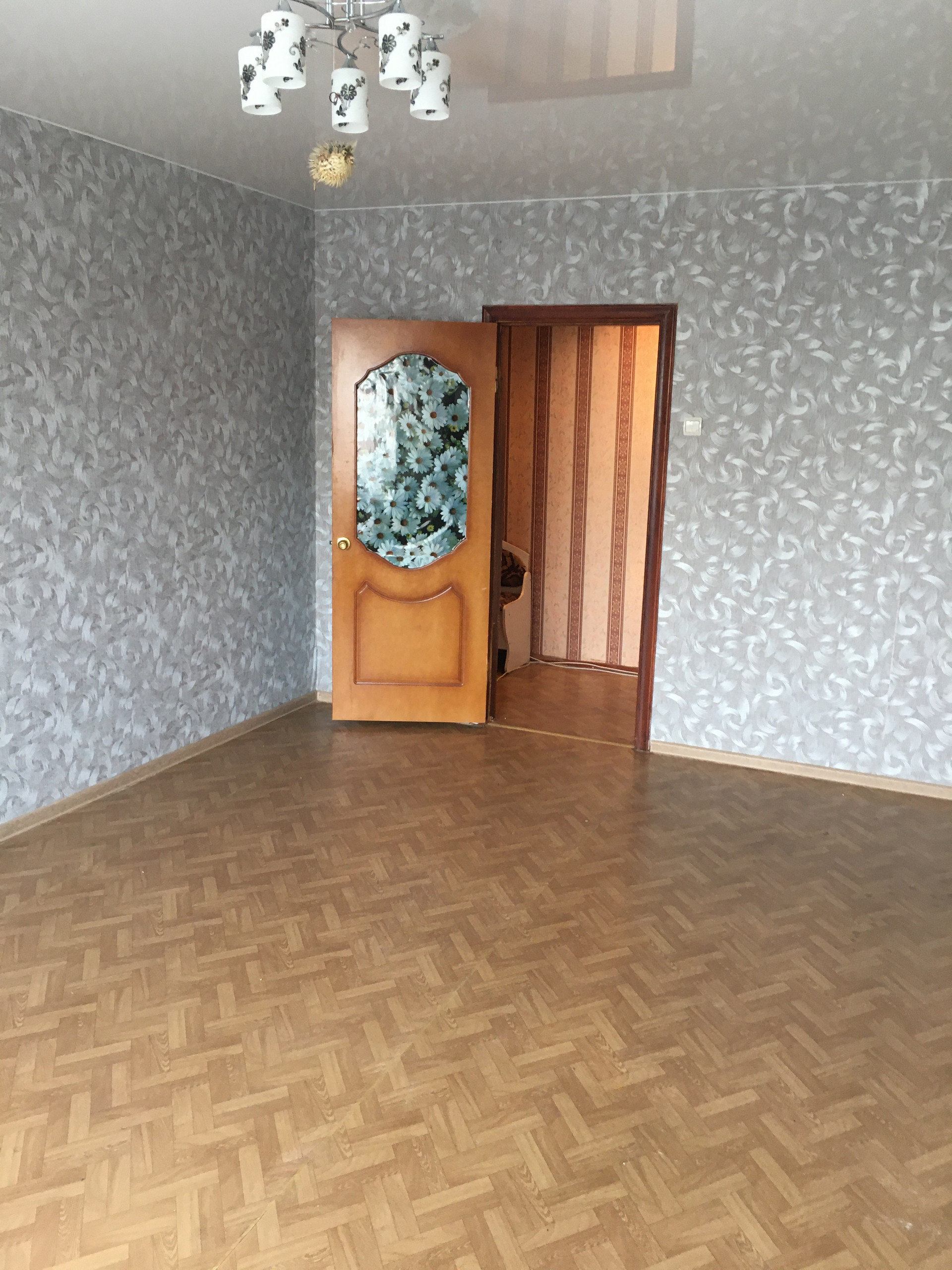- установлен глянцевый натяжной потолок в гостинной комнате;
