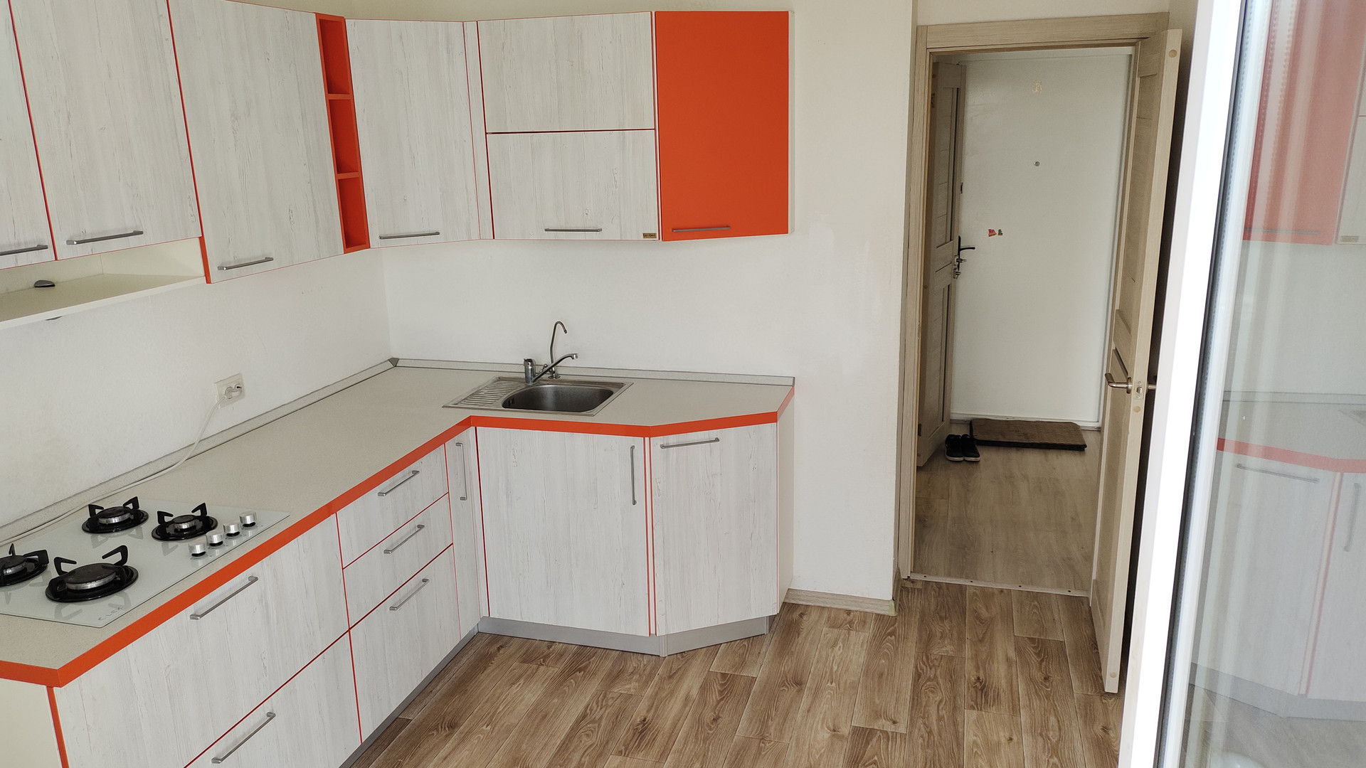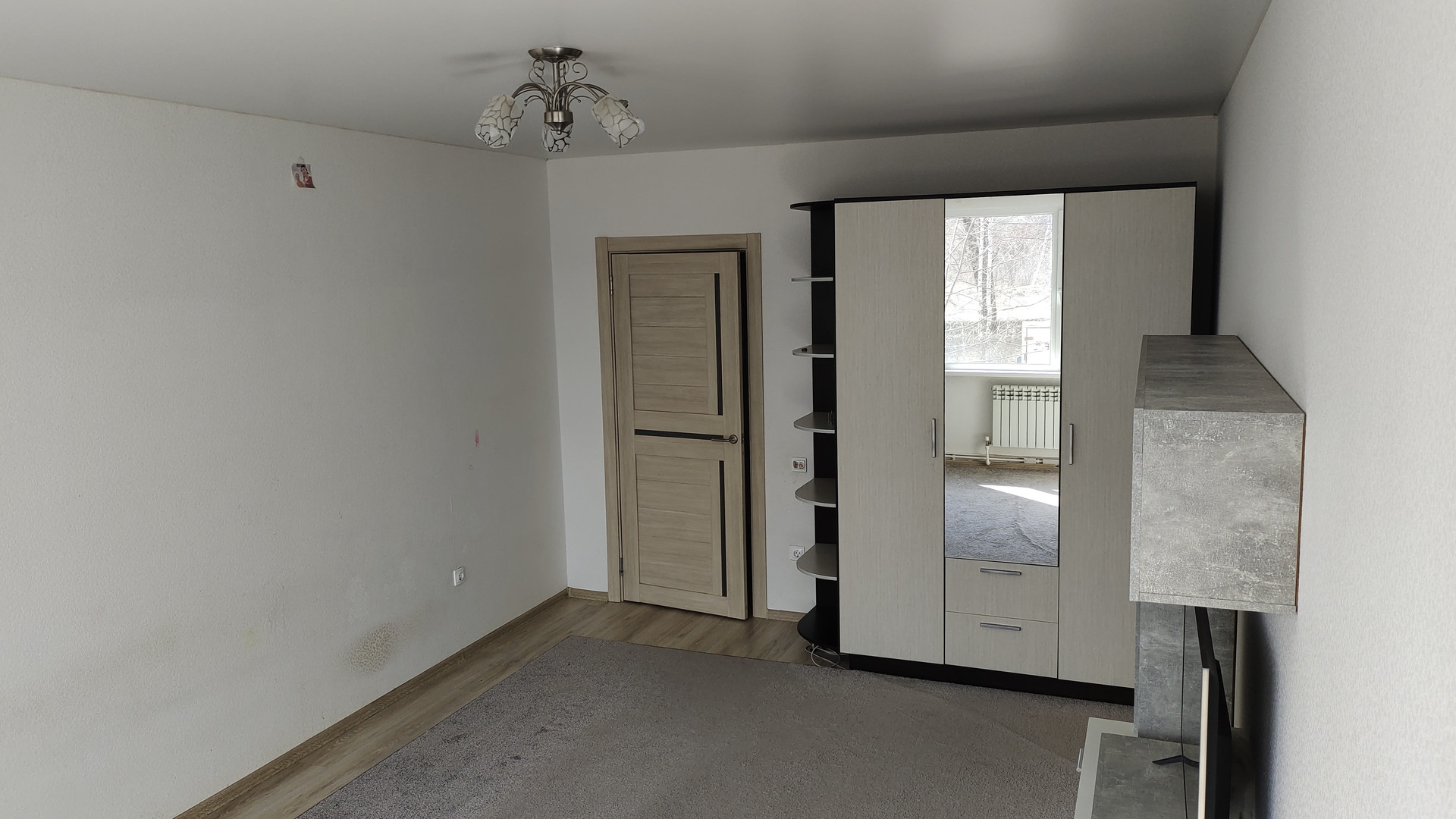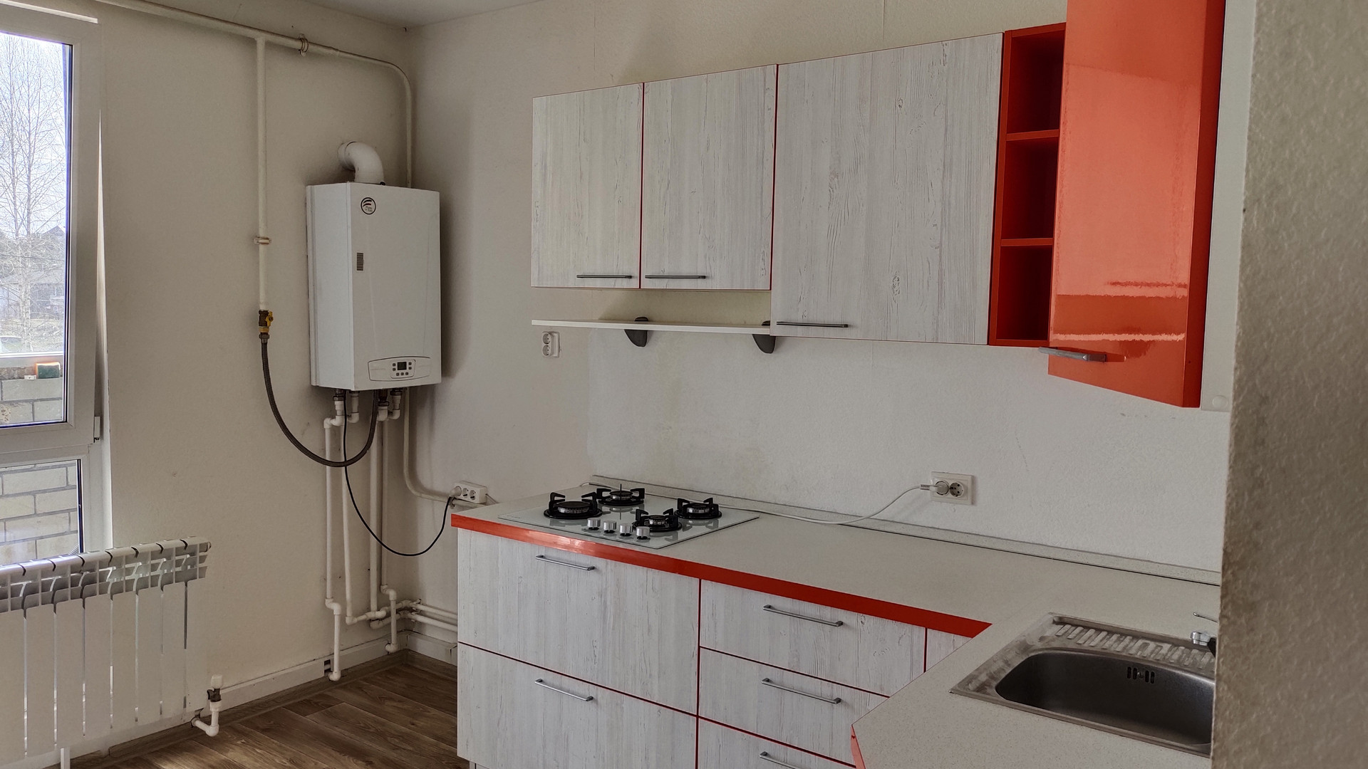 Продаем вместе с кухонным встроенным гарнитуром из МДФ, варочной газовой поверхностью, шкафом и стенкой-гостиной в комнате. Можно сразу жить.