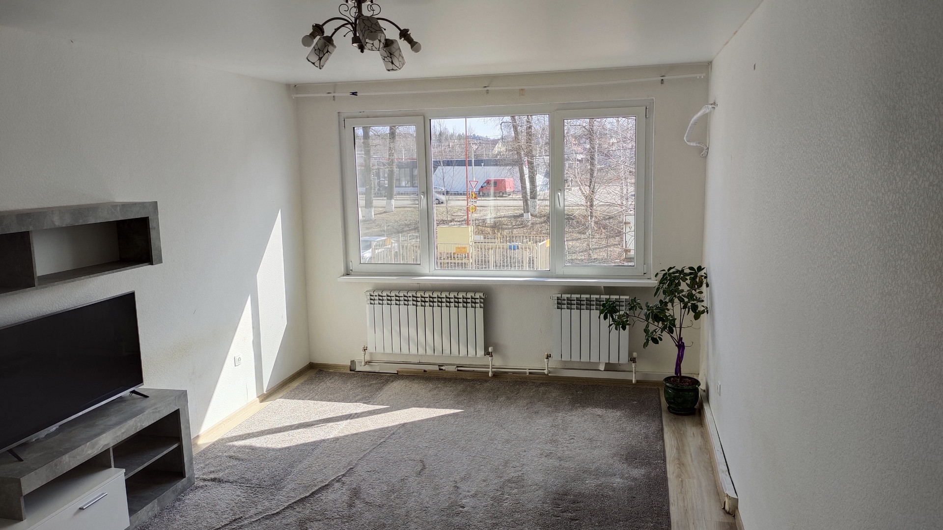 Окна выходят на восток на частный сектор напротив, на магазин Пятерочка, утром солнце до обеда. Стена подготовлена под кондиционер.