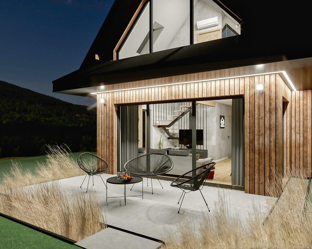 Базовый комплект LARCH - это дом с тремя комнатами (спальни/кабинет) и просторной кухней-столовой с выходом на крытую террасу шириной 3 метра и всеми необходимыми коммуникациями.