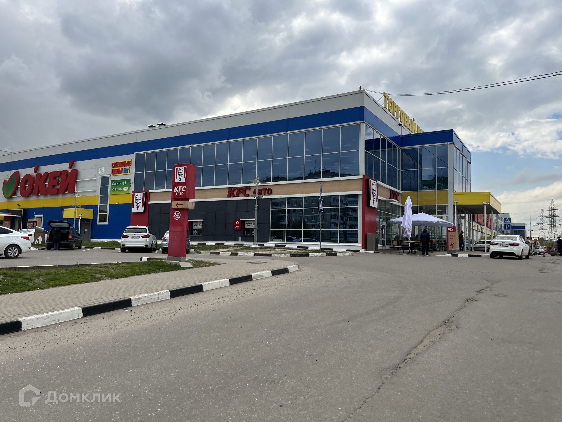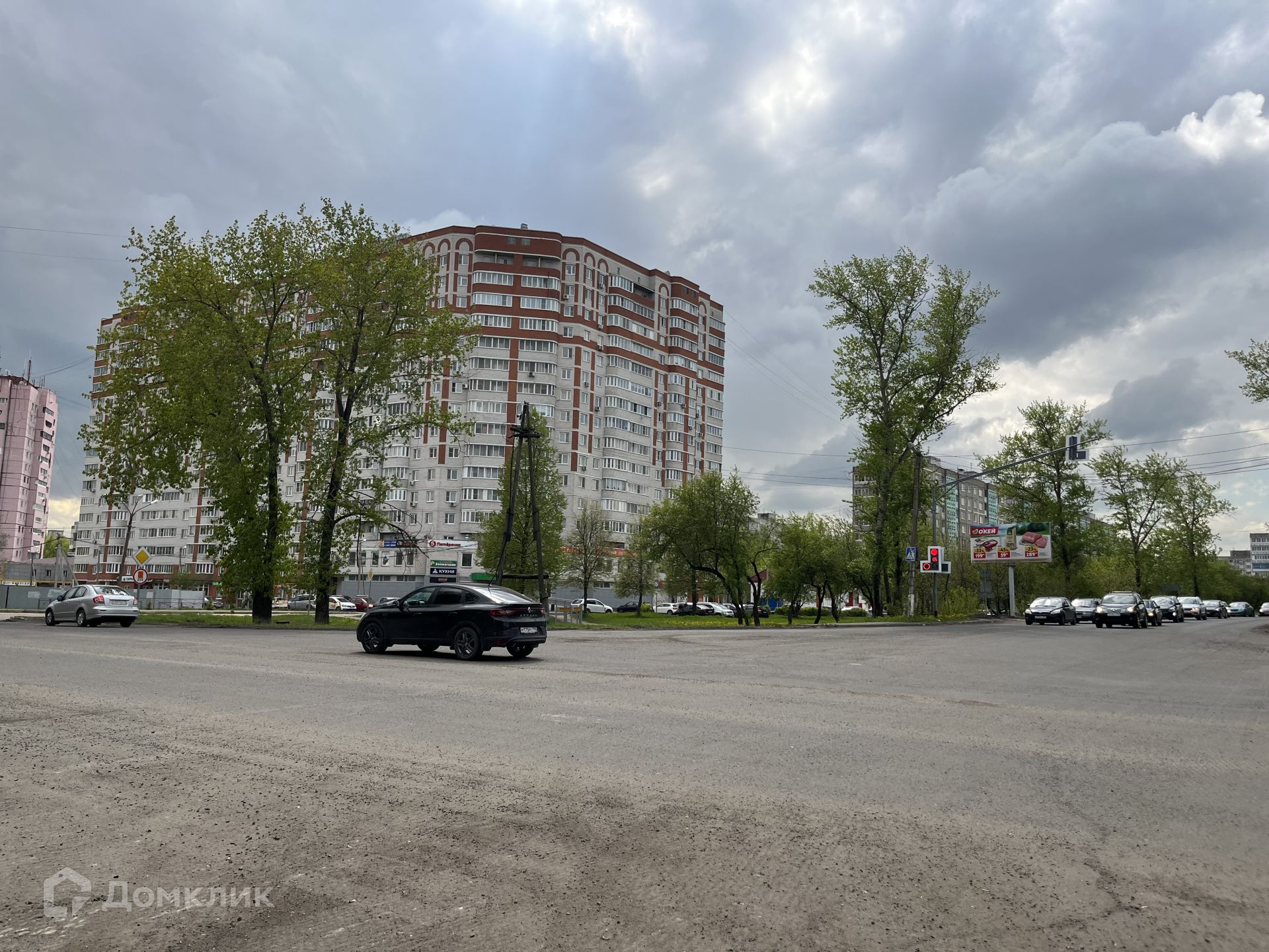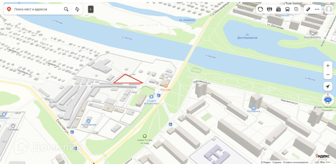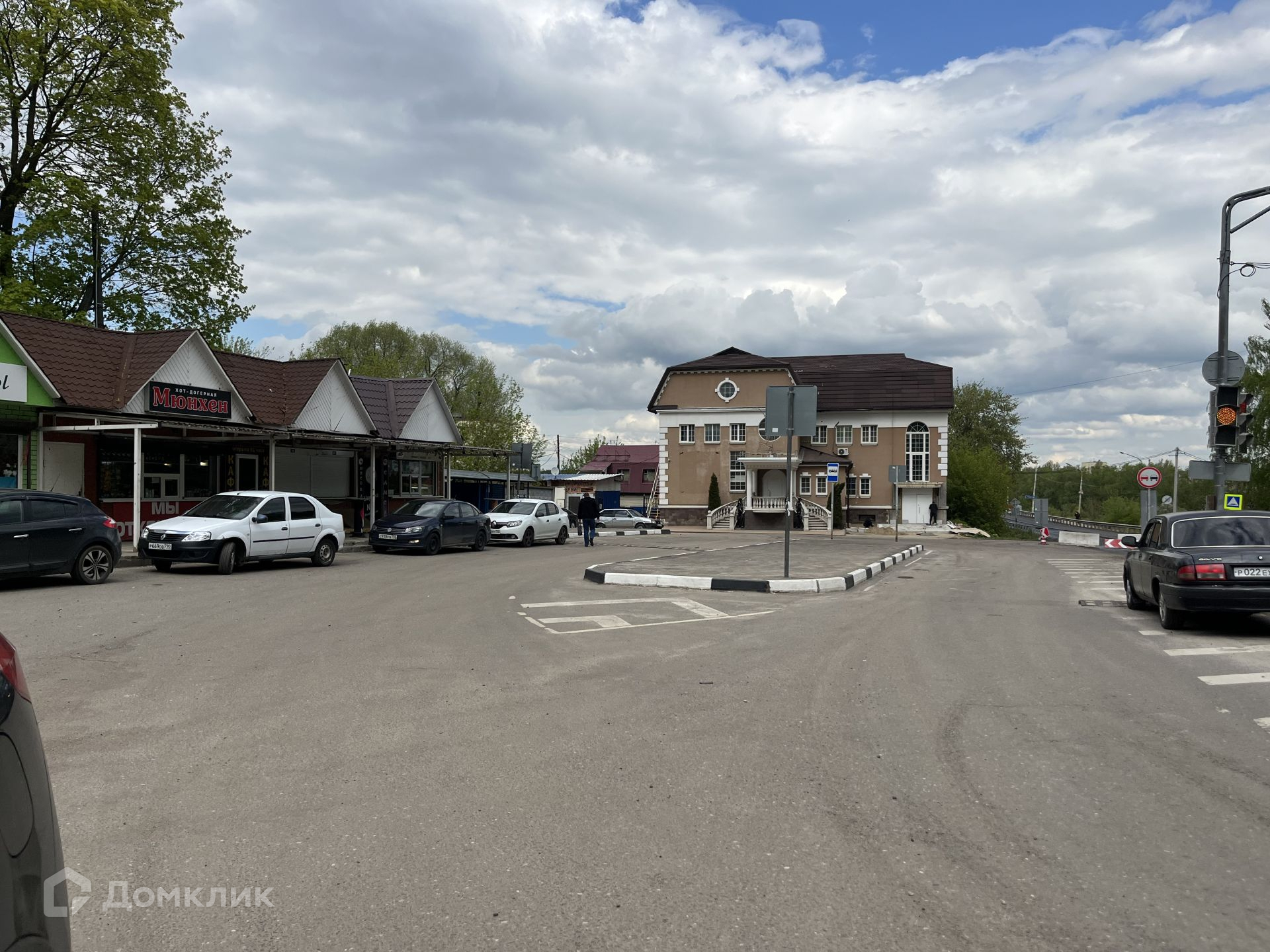Рядом расположены жилые дома, гостиница, автобусная остановка, река, торговые центры и гаражи.
