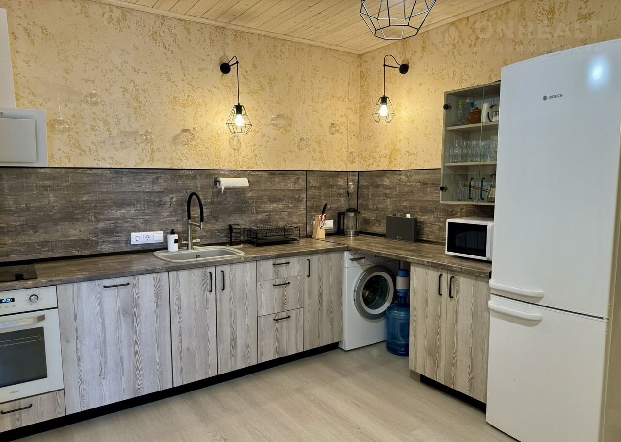 кухонная зона оснащена: духовой шкаф, СВЧ, посудомоечная машина на 60 см, эл.варочная поверхность, холодильник, блендер, однотипная сервировочная посуда.