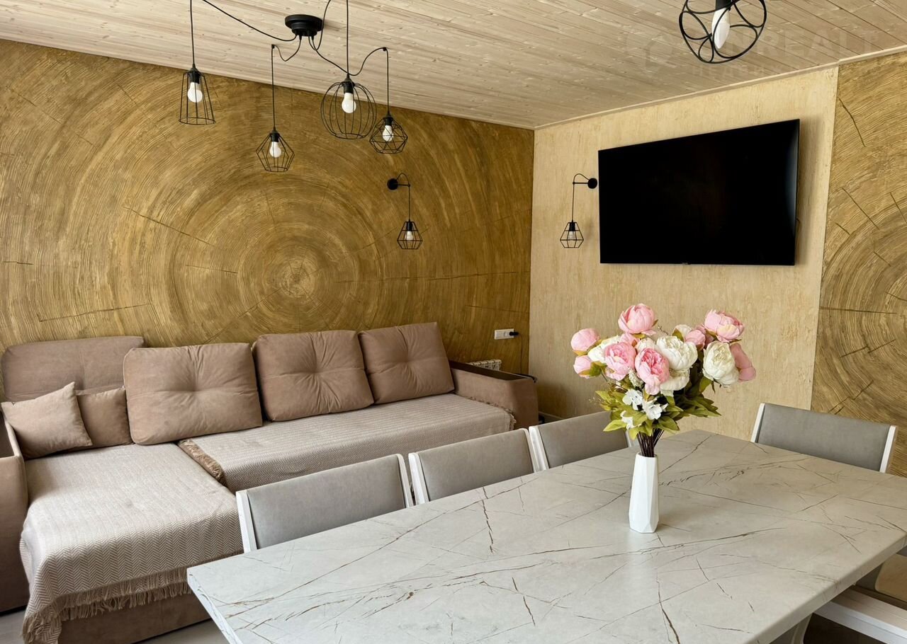 в гостиной установлен большой диван, большой телевизор со смарт-тв, стол на 8 персон с креслами