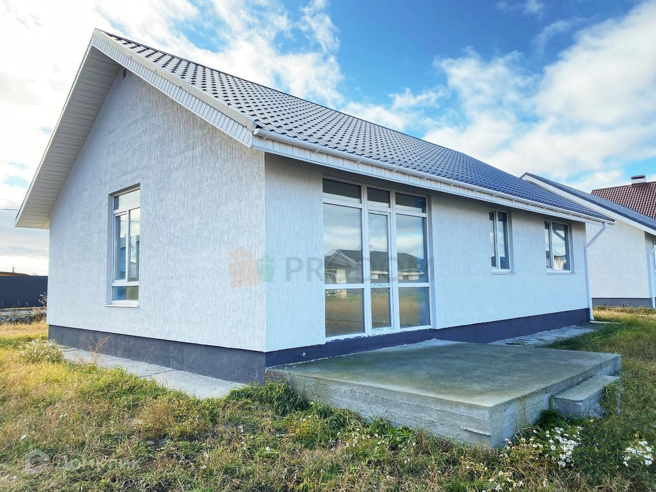 Фасад дома Оштукатуривание стен декоративной штукатурка короед выделенные серым цветом. Устройство отмостки. Устройство подшиты крыши из софитов Гарантия на такие виды работ как фундамент, кровля, стены составляет 5 лет. Гарантия на остальные работы 1 год.