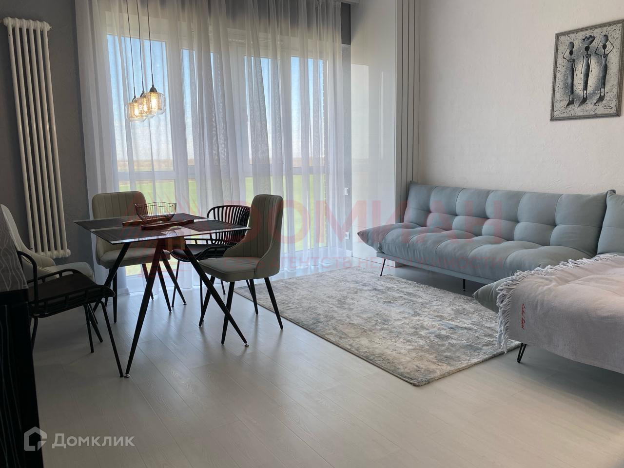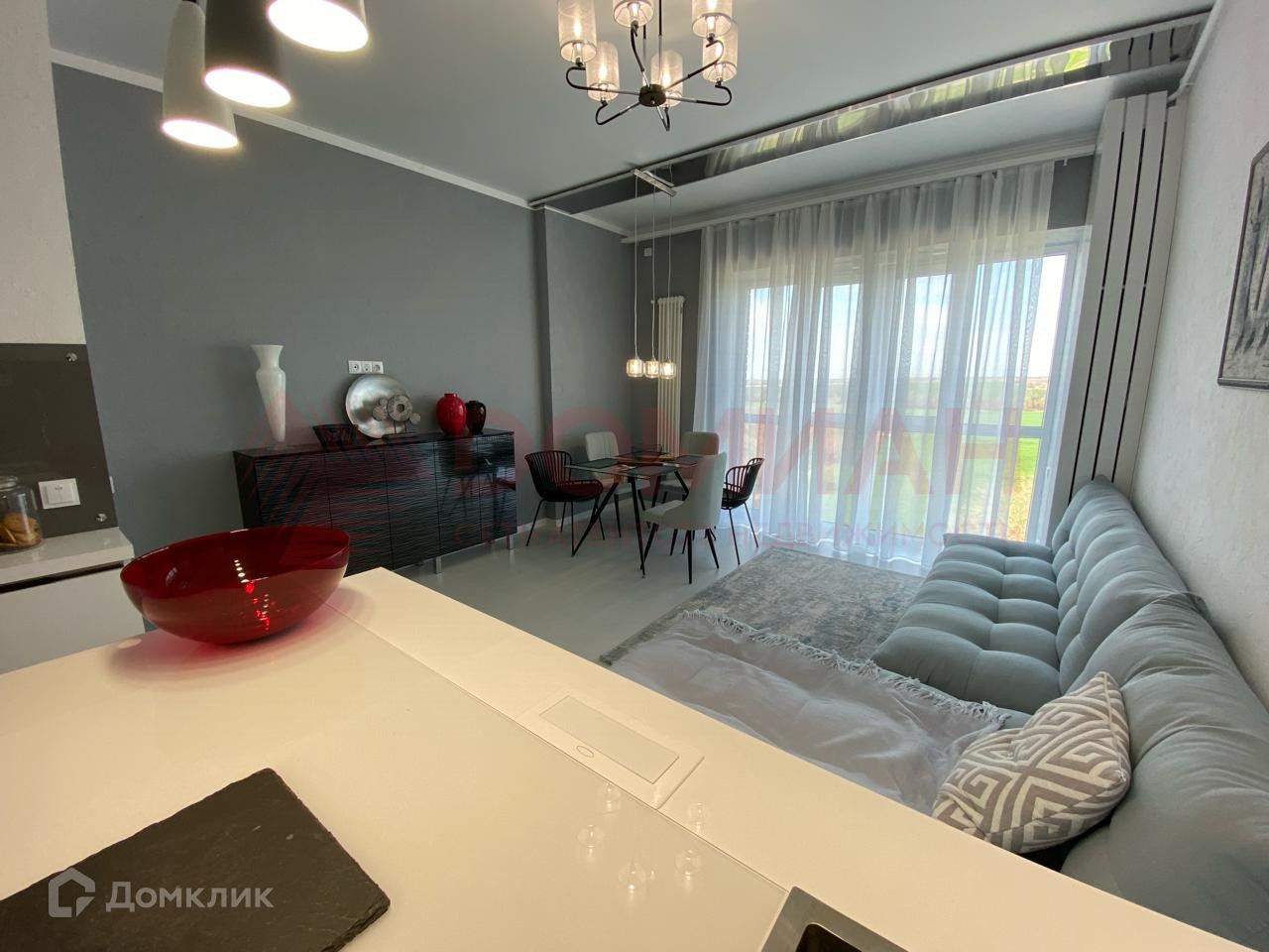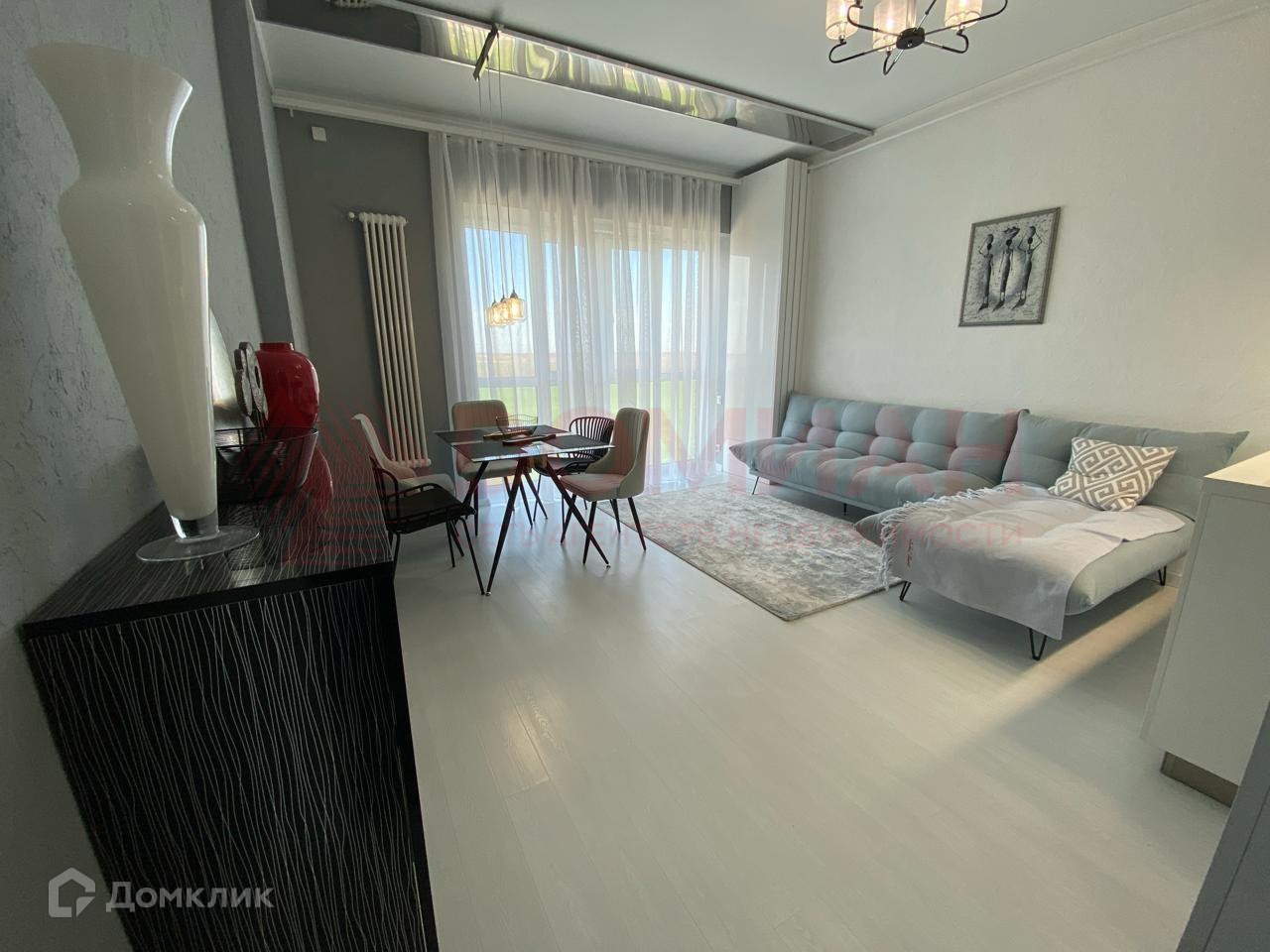 - Просторная гостиная с большими окнами.
