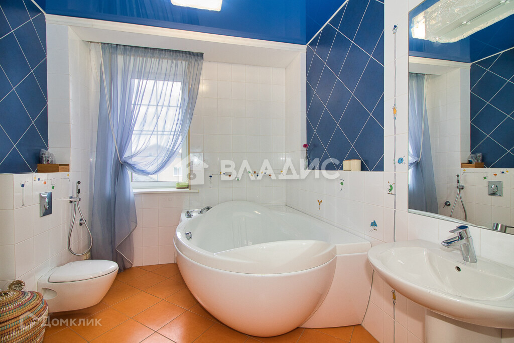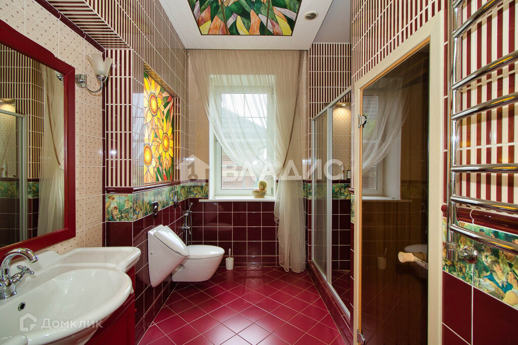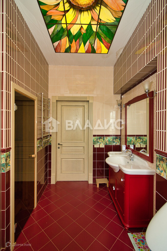 В ванной комнате на первом этаже присутствуют яркие цвета в интерьере ,которые объединяются в единую картину благодаря красочному витражу. Мебель для ванной - GAIA, Италия, сантехника  - JACOB DELAFON, Франция.