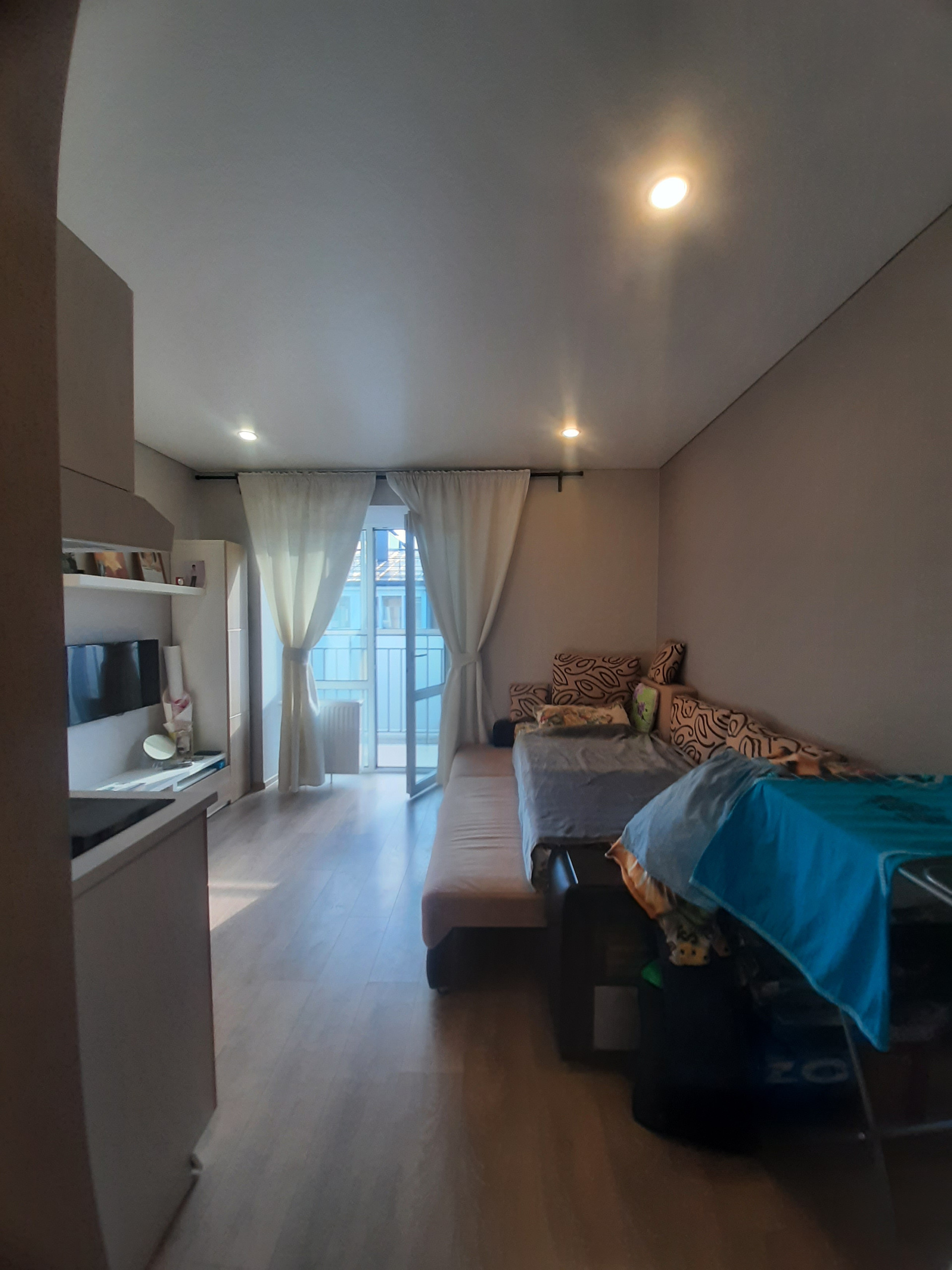 Площадь студии 22 кв.м., совмещенный санузел, лоджия, ванная комната площадью 3 кв.м.