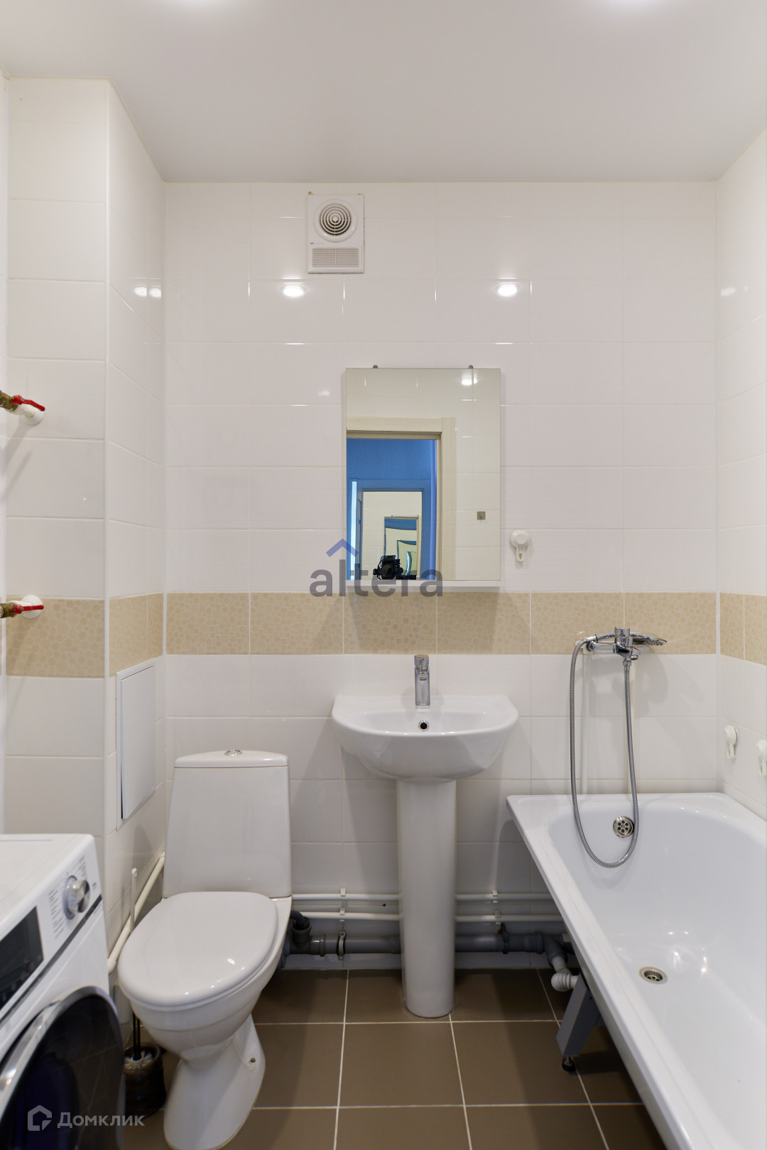 — Сан узел совмещенный в кафеле теплых тонов;