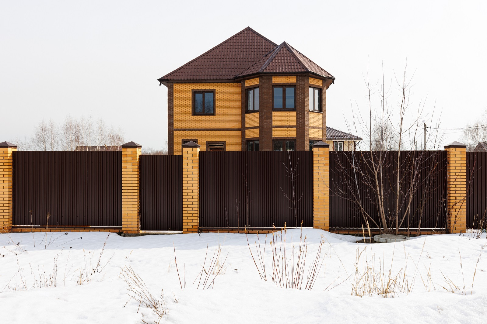 Забор из профнастила установлен на ленточном фундаменте с кирпичными стойками у ворот и у калитки.