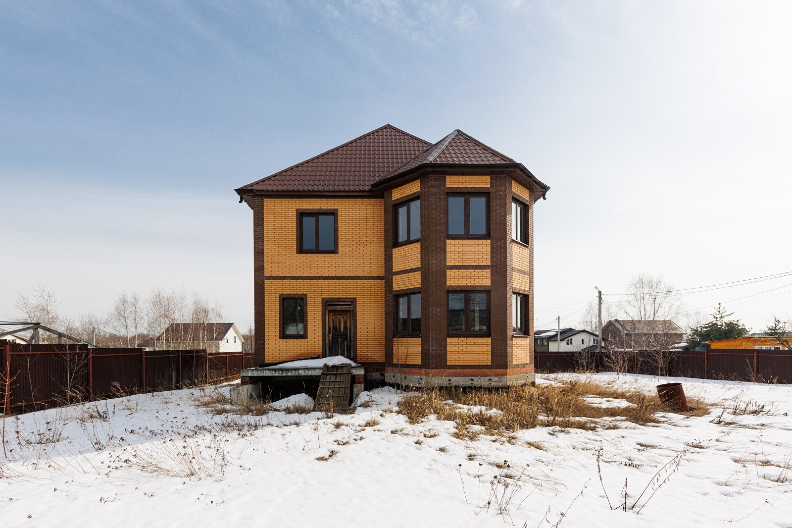 Энергоэффективные стеклопакеты Шуко с ламинацией под темное дерево в цвет облицовочного кирпича. Цоколь очень качественно гидроизолирован, что легко проверить.