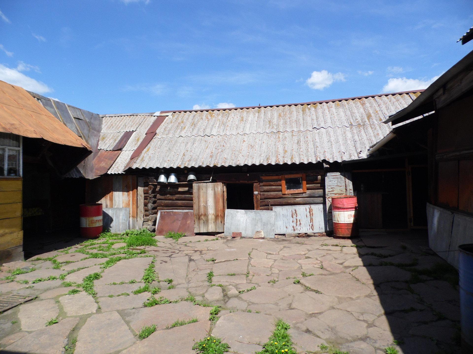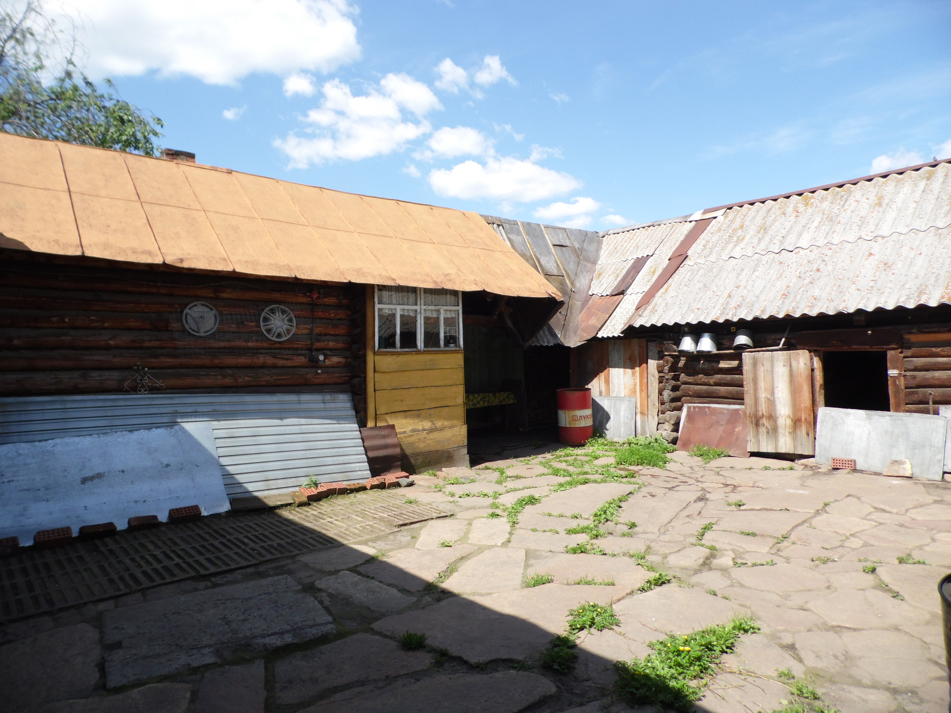Большой двор вымощенный плитняком. Широкая придомовая территория.
