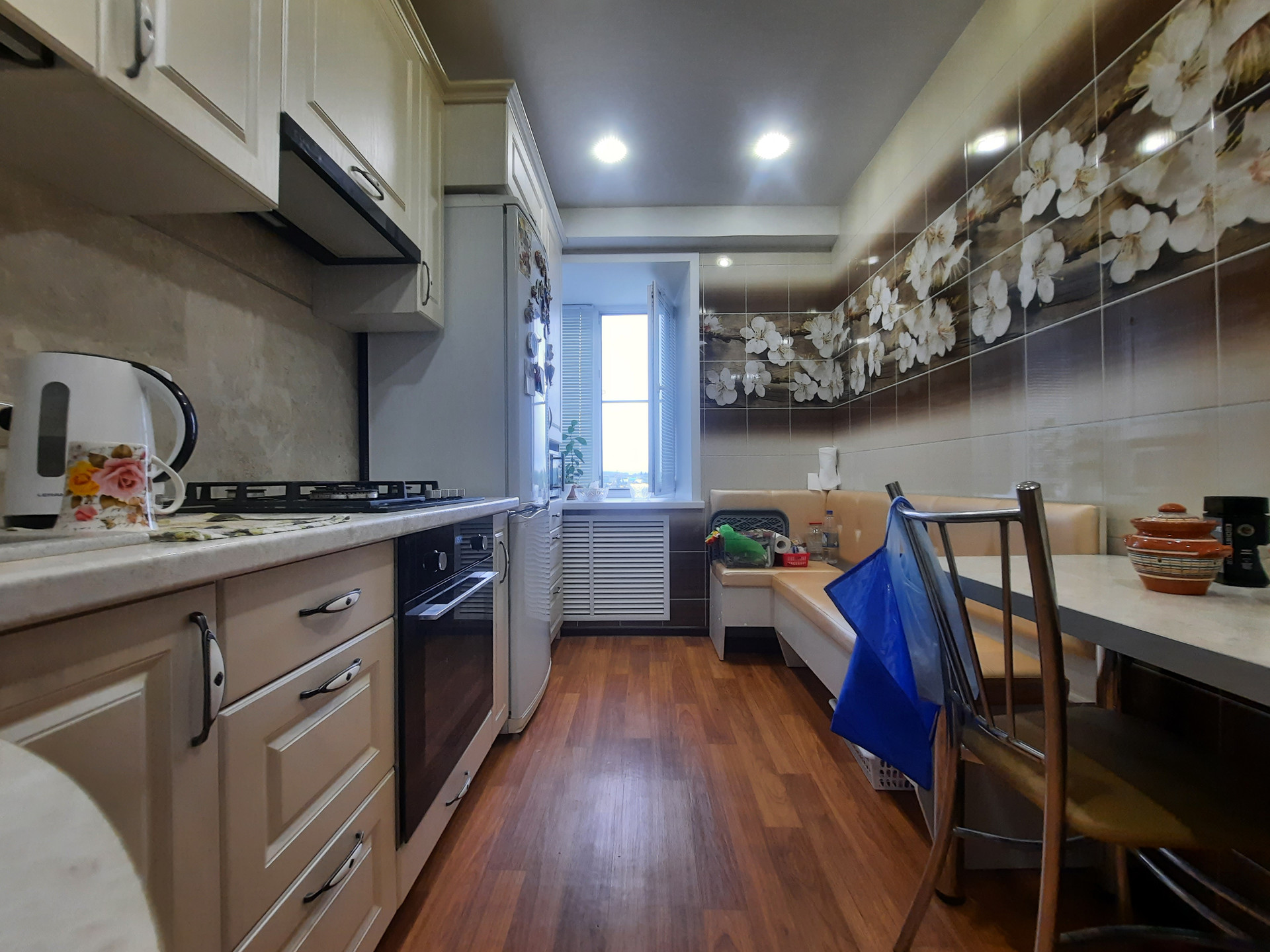 Пластиковые стеклопакеты, входная сейф-дверь, просторная лоджия с видом на сосновый бор - застеклена и обшита, натяжные потолки во всей квартире, заменена сантехника и система отопления, новые межкомнатные двери, на полу линолеум, а так же есть печь которой можно пользоваться в холодное время года.