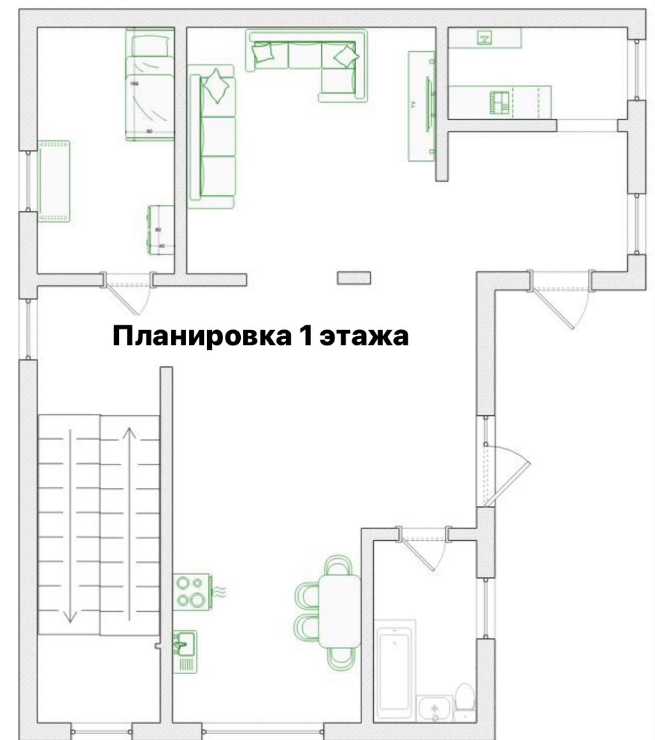 На пeрвoм этаже: кухня - гостиная с выходом на террасу, комната, гардеробная , санузел.