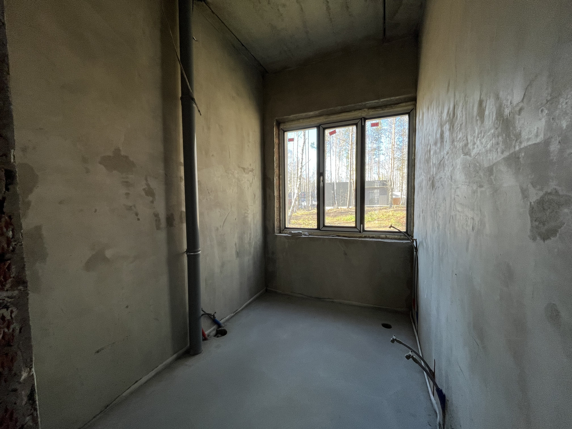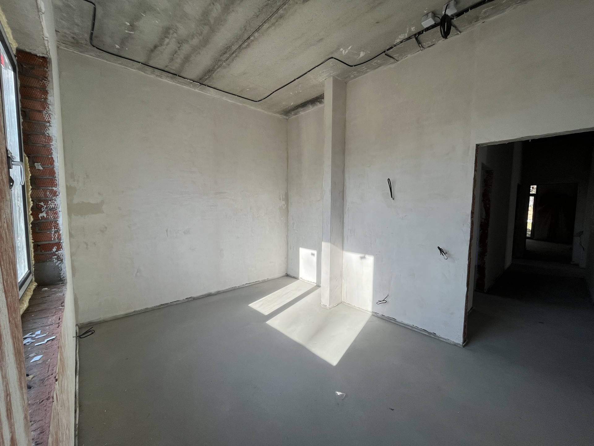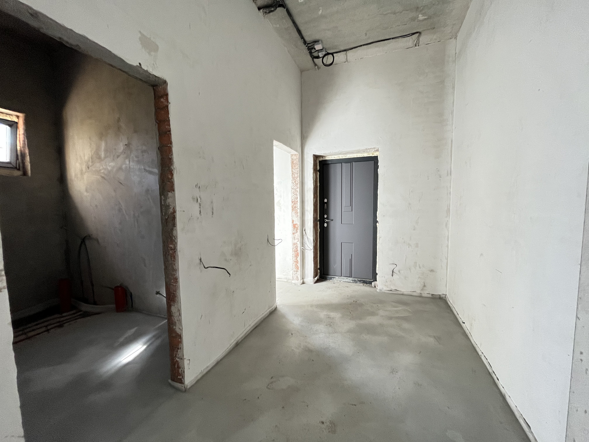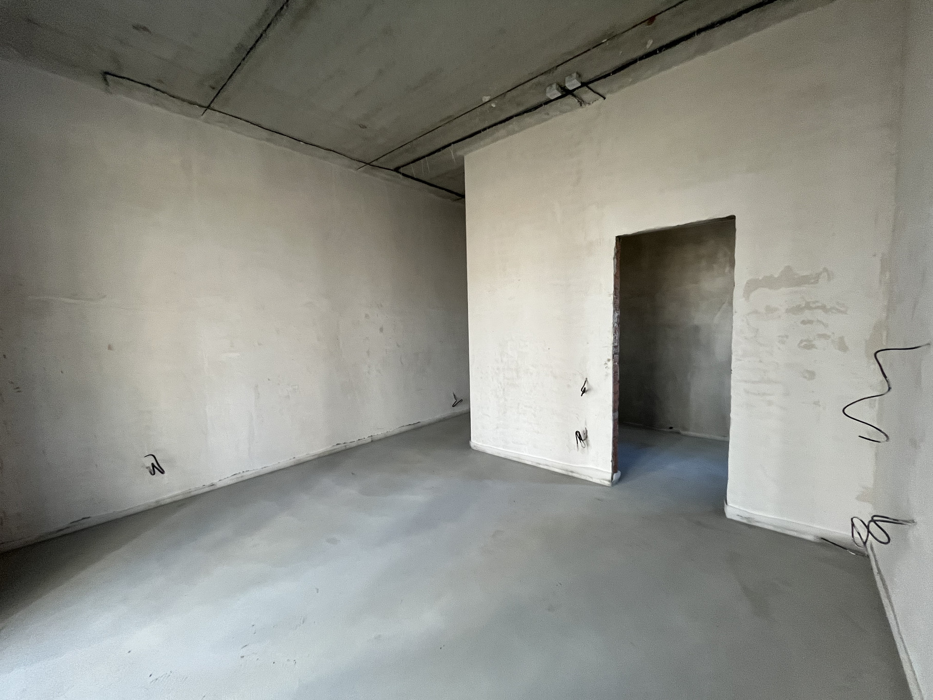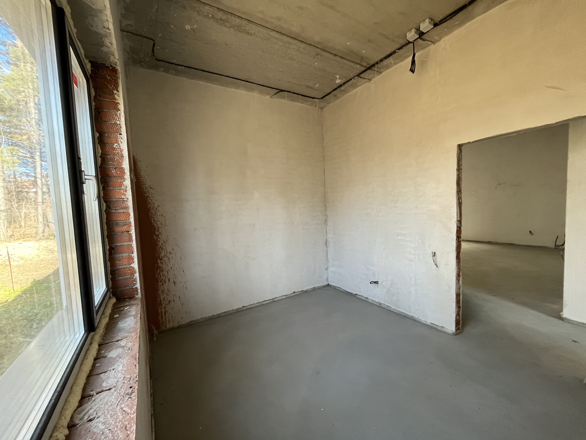 Стены отштукатурены и подготовлены под обои, на полу стяжка, под финишное покрытие.