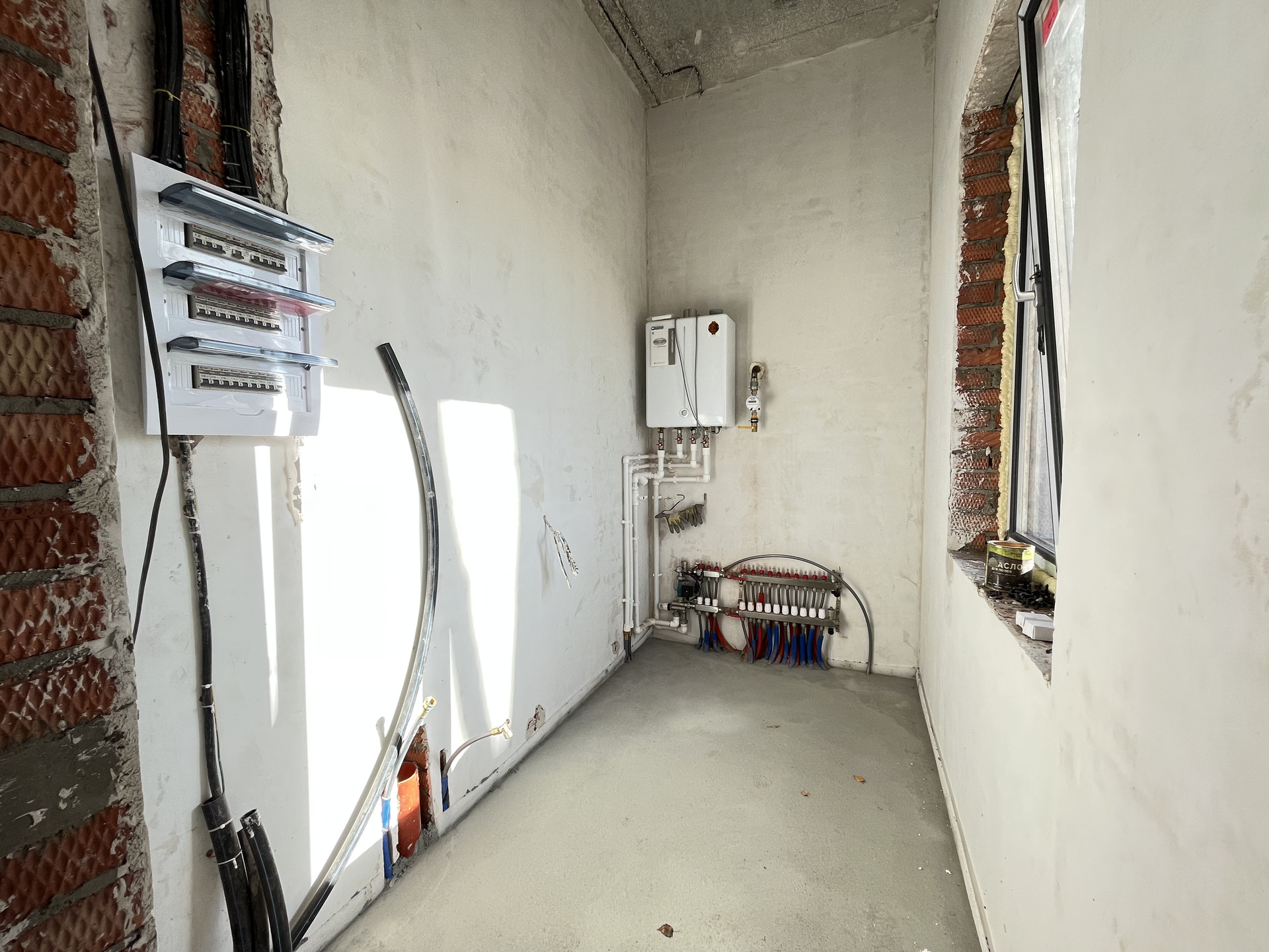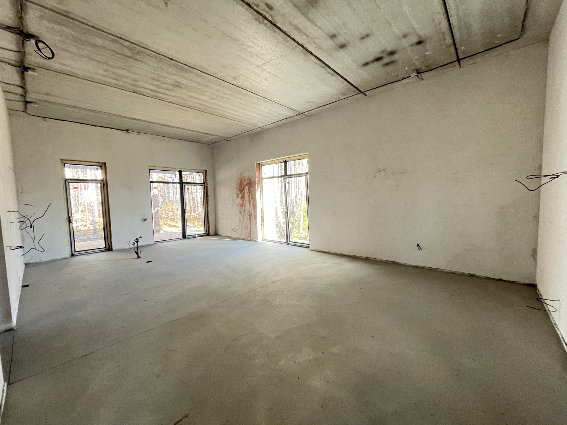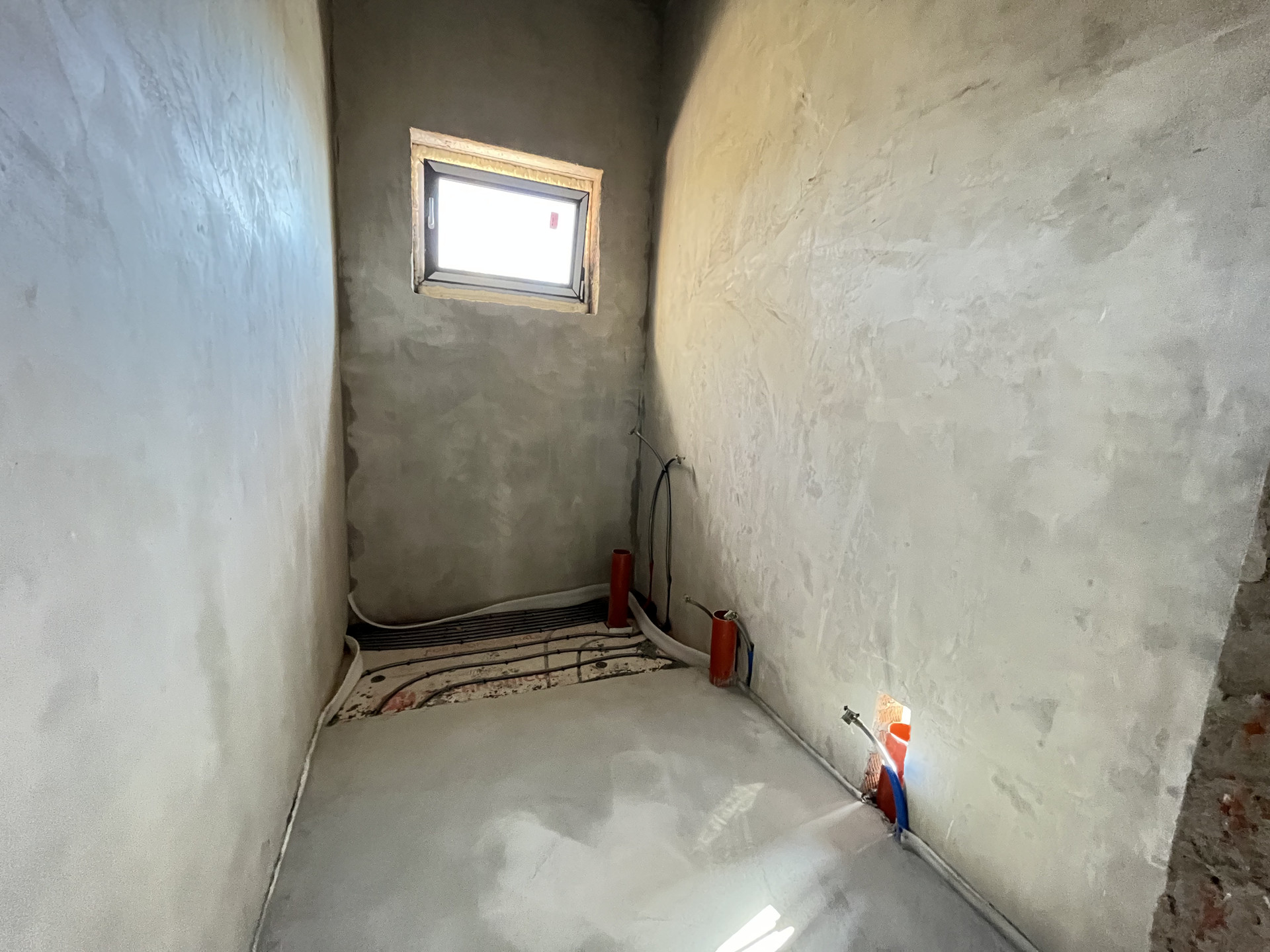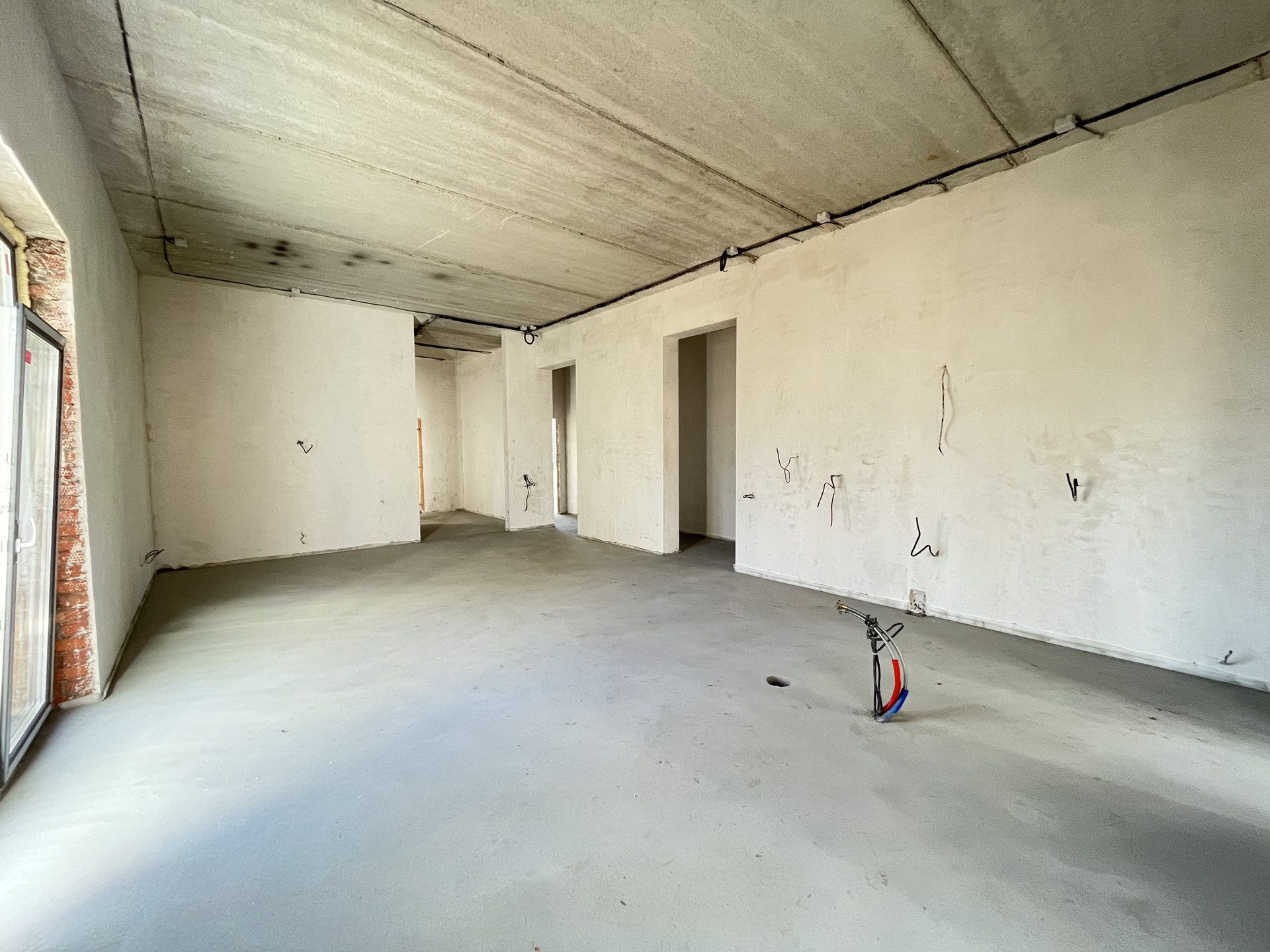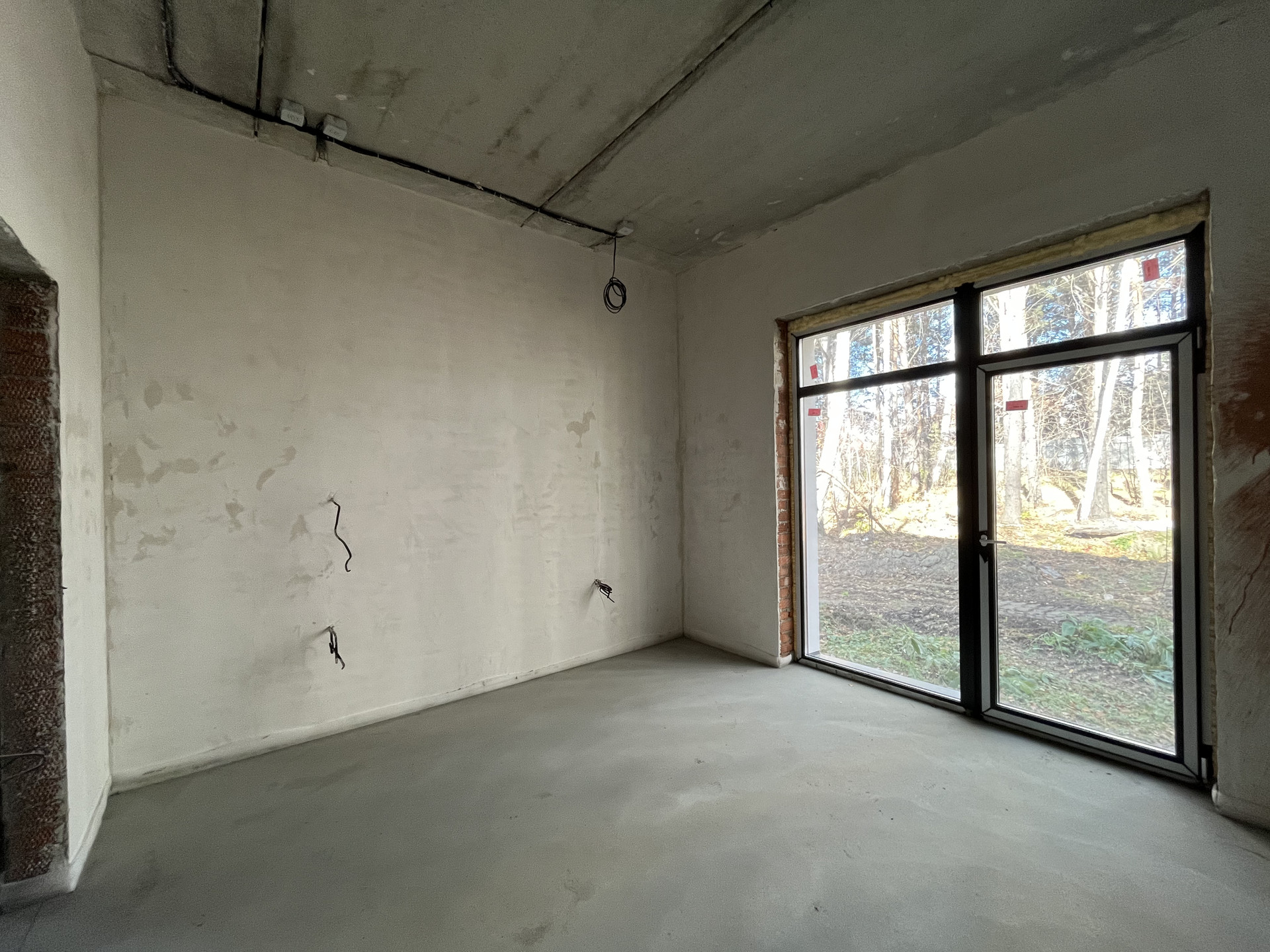 Стены отштукатурены и подготовлены под обои, на полу стяжка, под финишное покрытие.
