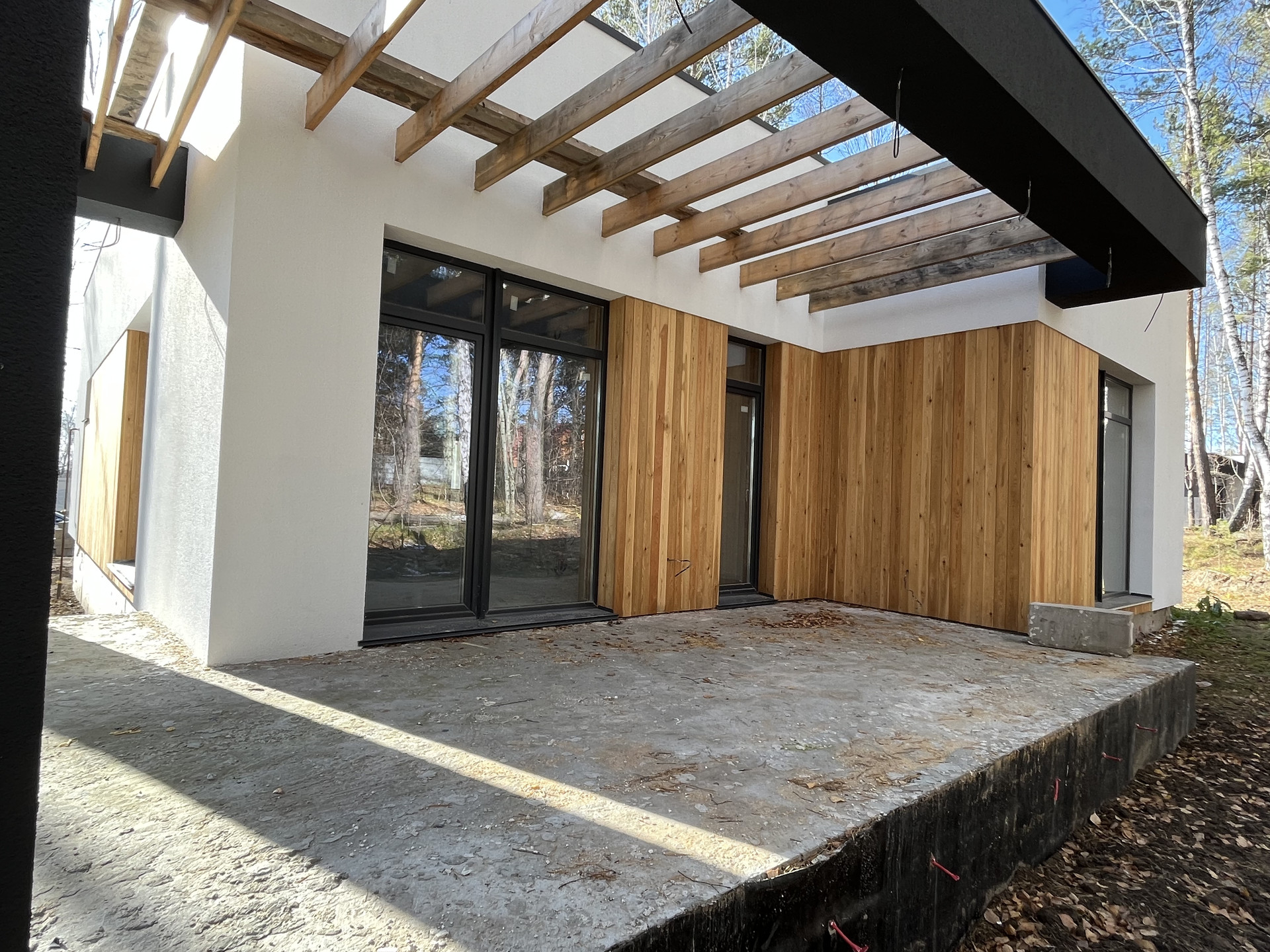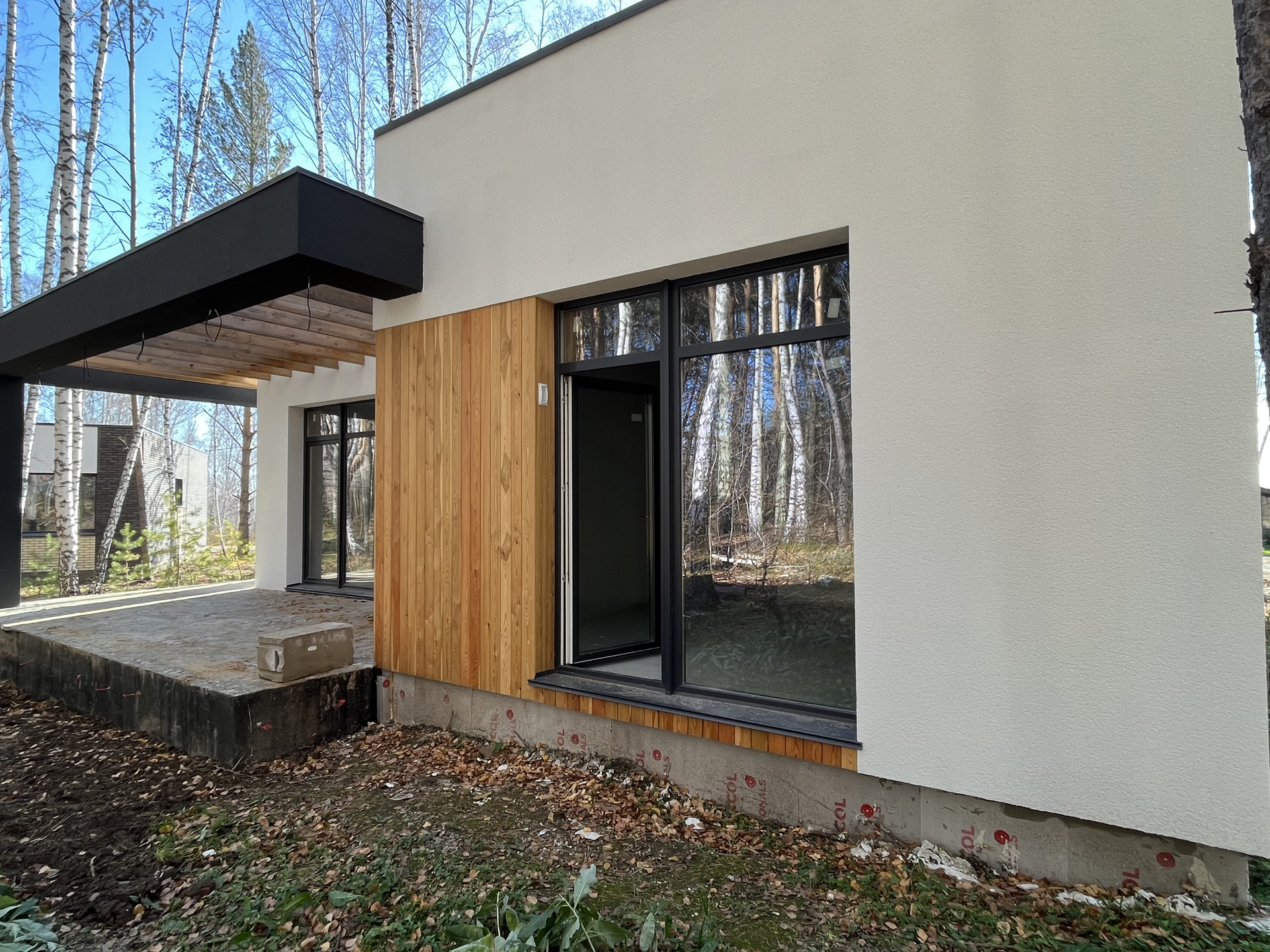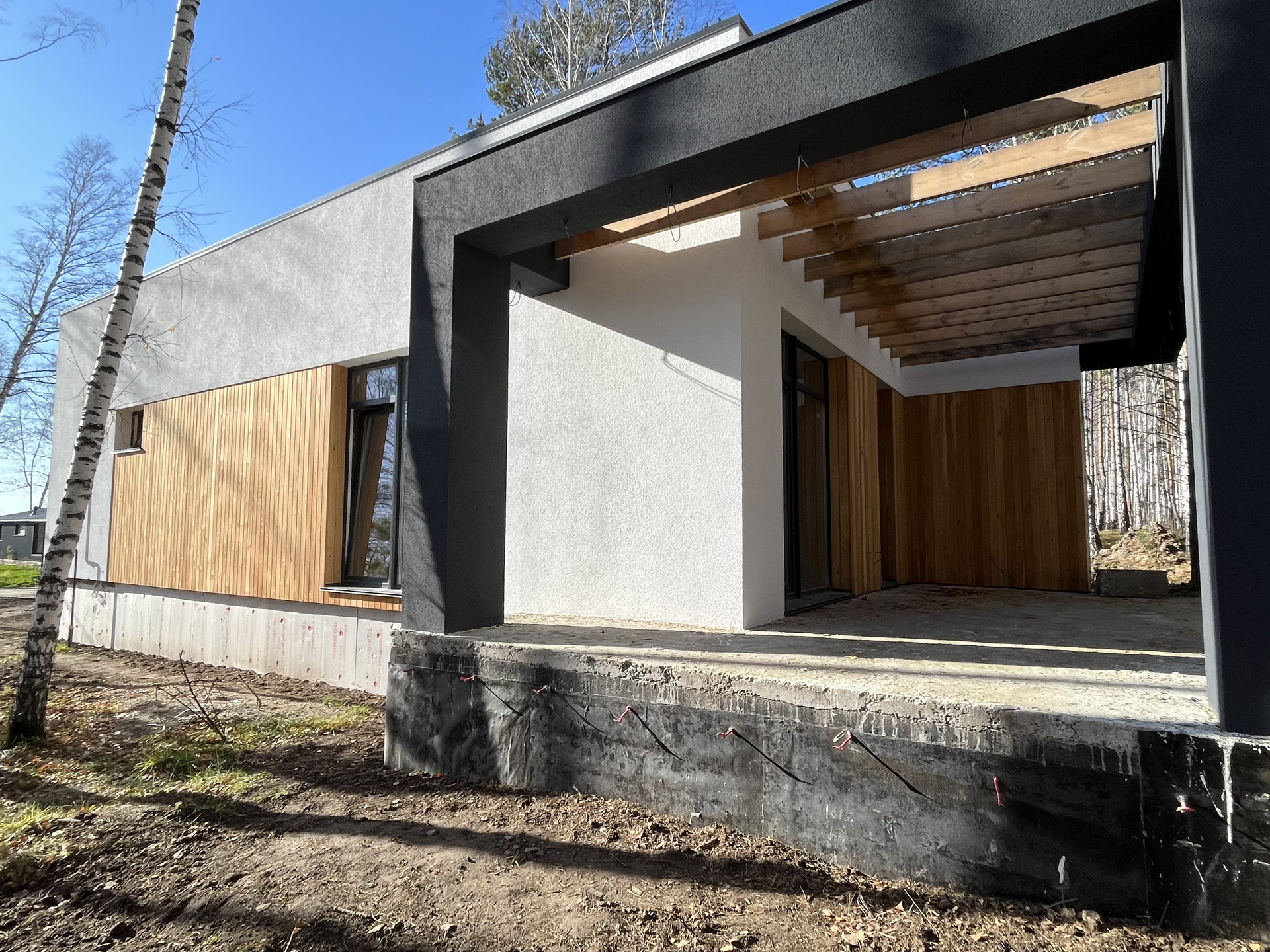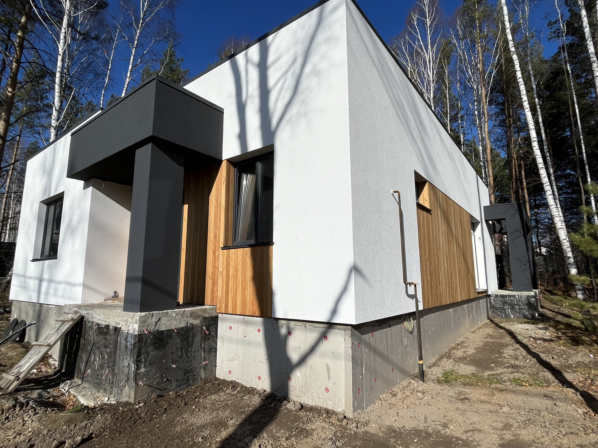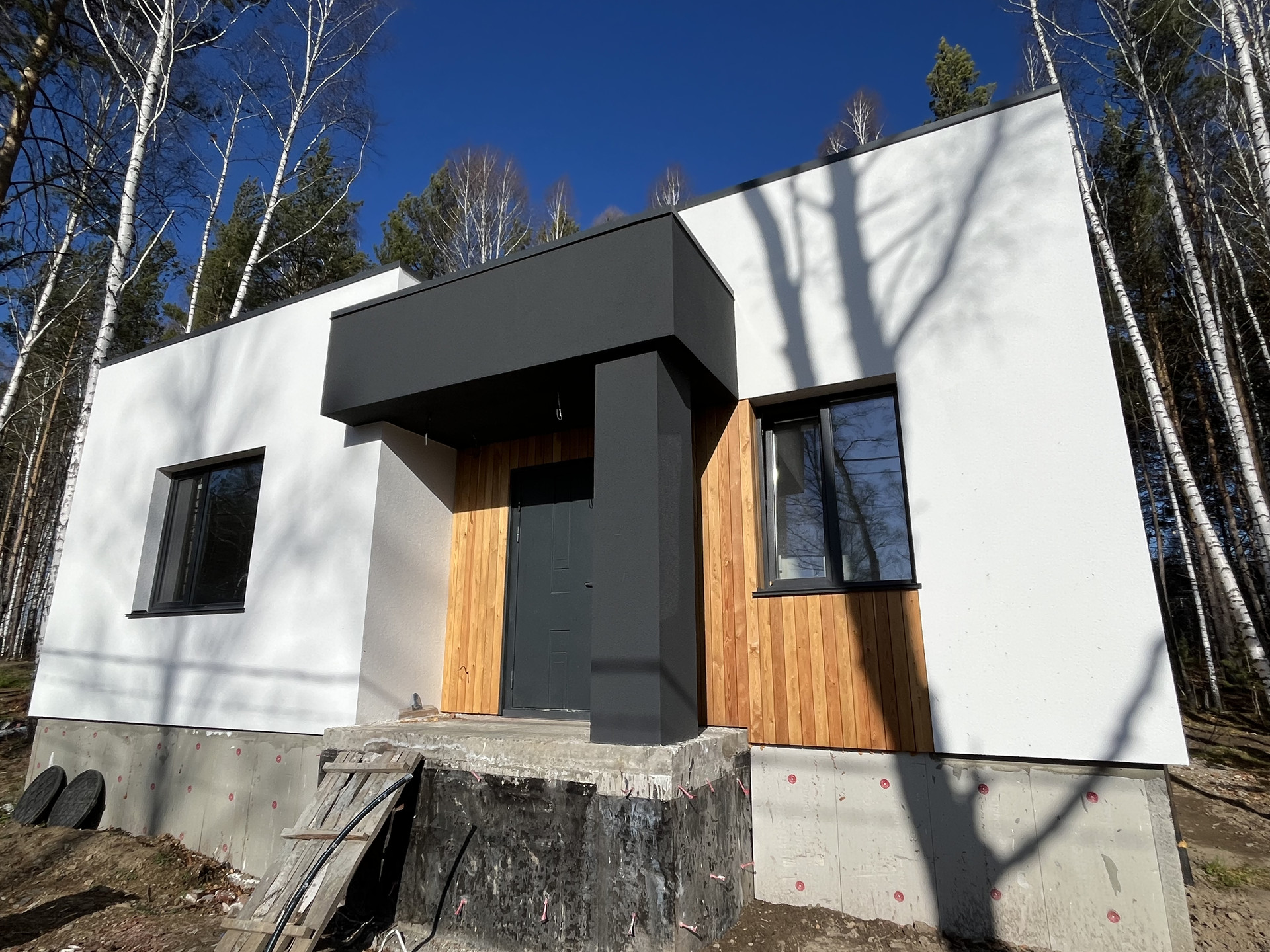 Утеплитель - фасадный пенопласт+фасадная штукатурка с деревянными вставками.