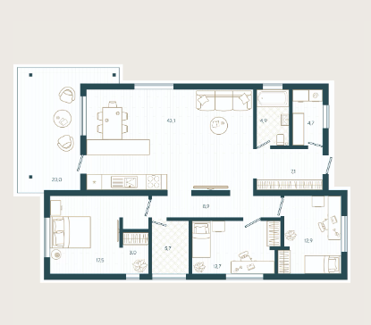 Планировка идеальна - 3 спальни, 2 сан узла и большая шикарная кухня гостиная!