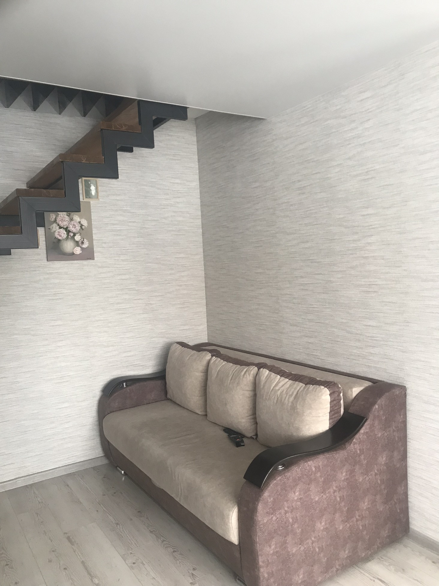 В квартире остаётся кухня с вытяжкой и варочной панелью, шкаф на втором этаже, кровать.