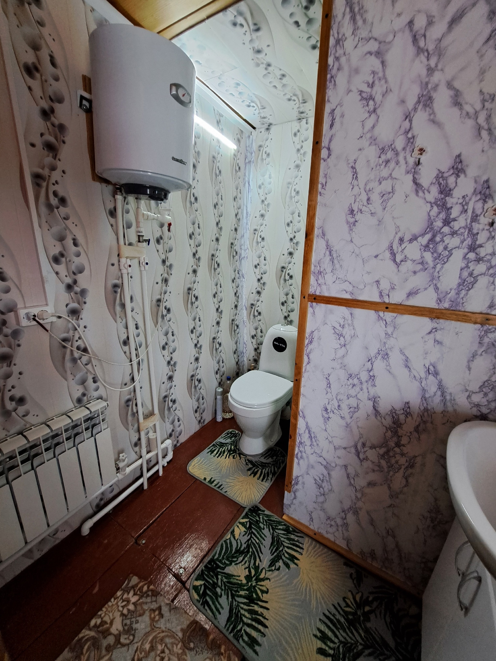 Большая комната разделена перегородкой на две комнаты. Просторная кухня с газовым оборудованием (оборудование установлено 2021). В дом заведены: газ, вода, электричество и канализация. Санузел совмещенный, просторный.
