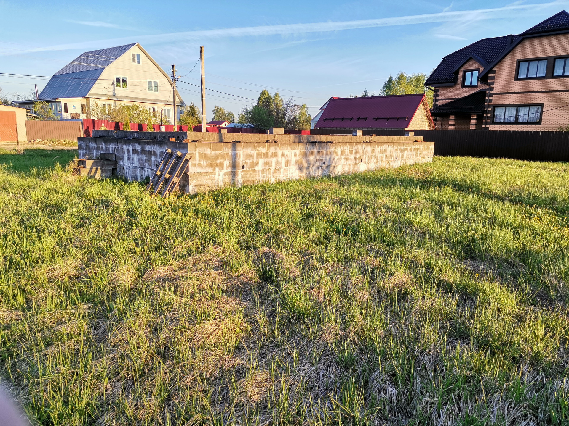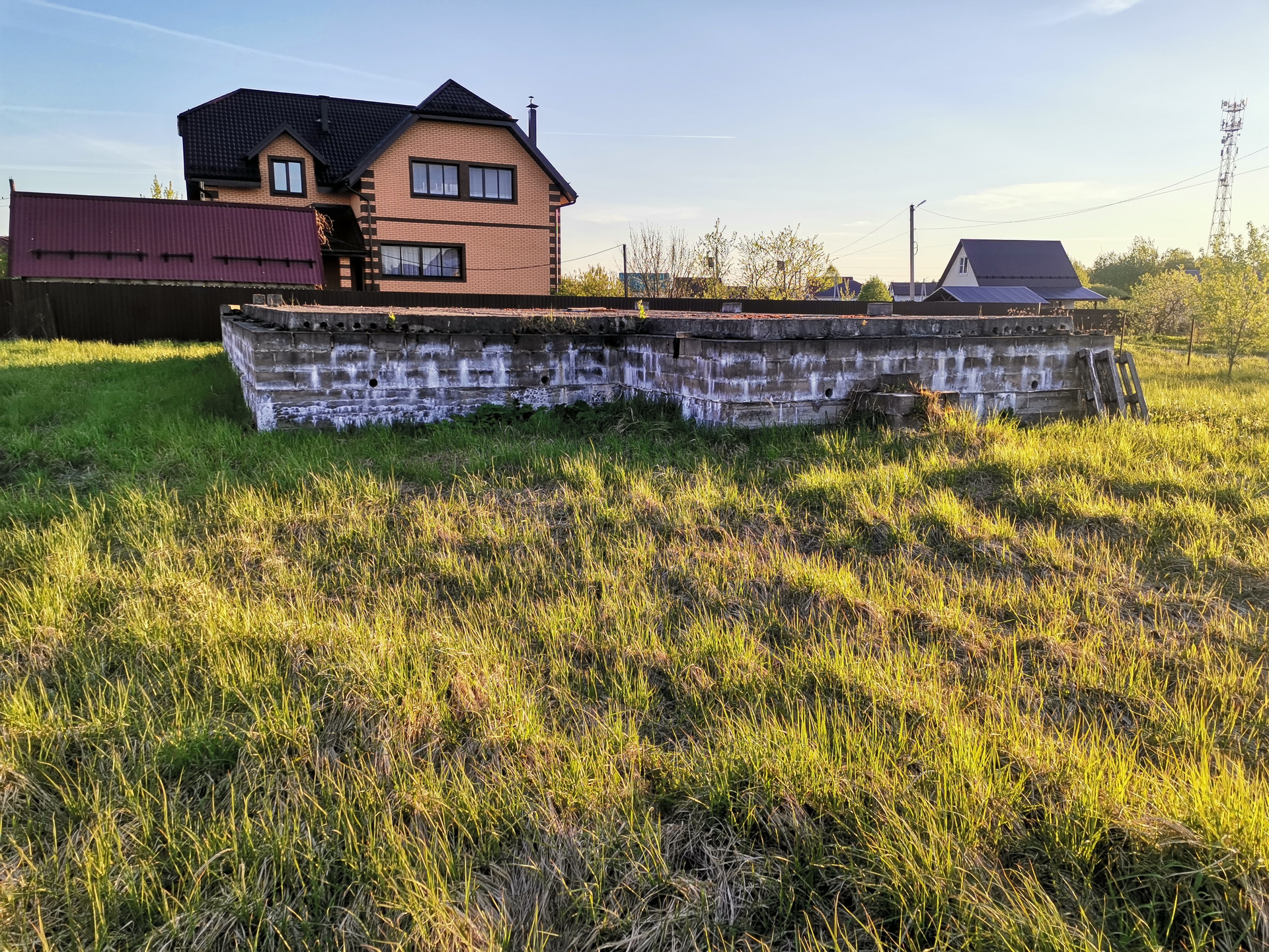Земельный участок с фундаментом (10м на 10м + 3м на 5.5м, монолит , залит в глубину на 1.5м и на 0.6м от уровня земли, на фундамент выложено 3 ряда блоков это еще+ 0.6м, общая высота фундамента от земли 1.2м, фундамент перекрыт плитами перекрытия), участок обнесен забором(сетка рабица) есть въездные ворота, к участку можно подъехать с 2-х сторон, с одной стороны дорога гравийная, с другой асфальтная крошка. Есть свет 15кв, хозблок 3м на 3м, газ по границе участка (6метров от фундамента), колодец(8 колец).  90км от мкад.
