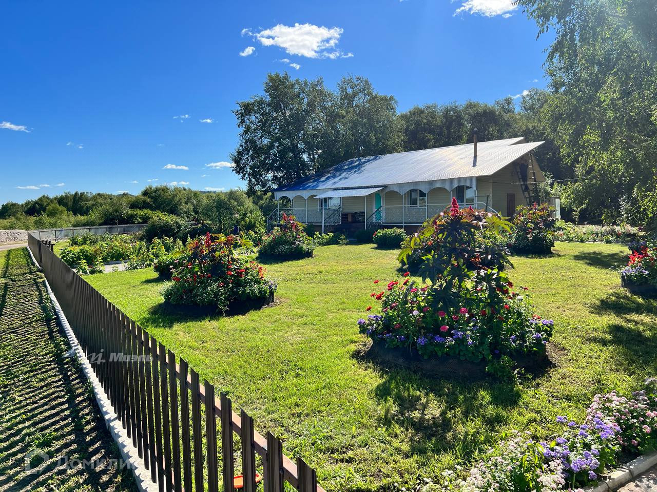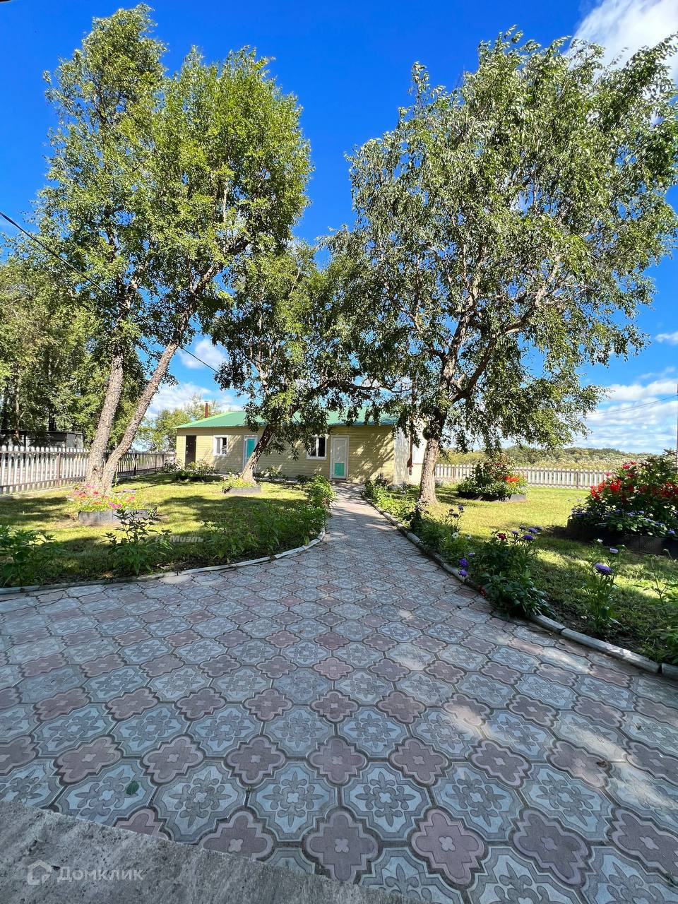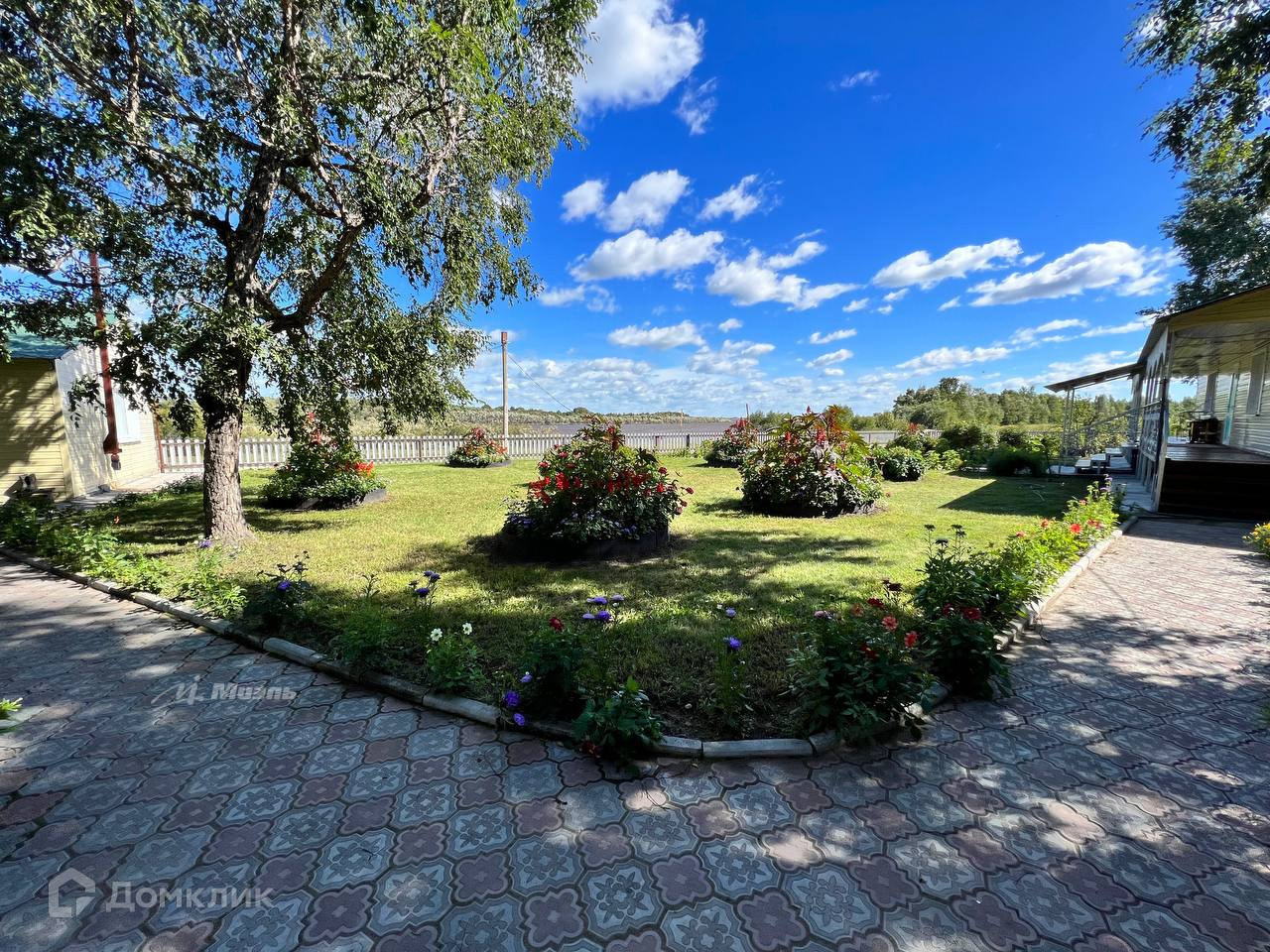 -Двор ухожен, клумбы с цветами, черные березы, плодово-ягодные насаждения, Слива, Малина, Жимолость, Вишня, Смородина
