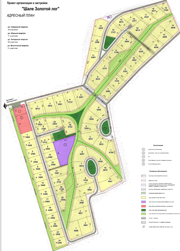 Всего на территории запроектировано 70 участков застройки. В границах территорий общего пользования предусмотрено размещение управляющей компании, спортивных и детских площадок, водозаборных сооружений, спортивно-рекреационных зон.
