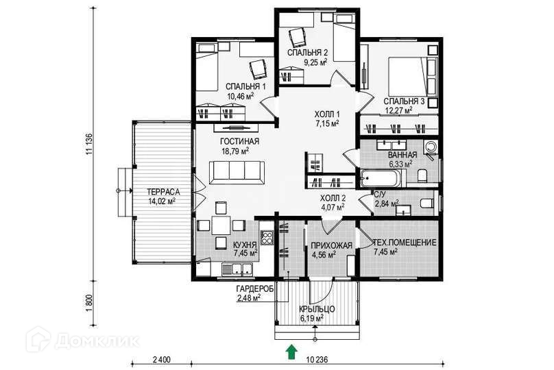 Прихожая, в которую проходим с крытого крыльца, позволяет попасть в гардероб и техническое помещение, а также является барьером между холодным, уличным воздухом и жилой частью дома. Кухня совмещена с гостиной и двумя холлами, которые в свою очередь ведут в три уютные спальни от 9 до 16 метров, ванную и санузел. Из гостиной предусмотрен отдельный выход на крытую, просторную террасу.